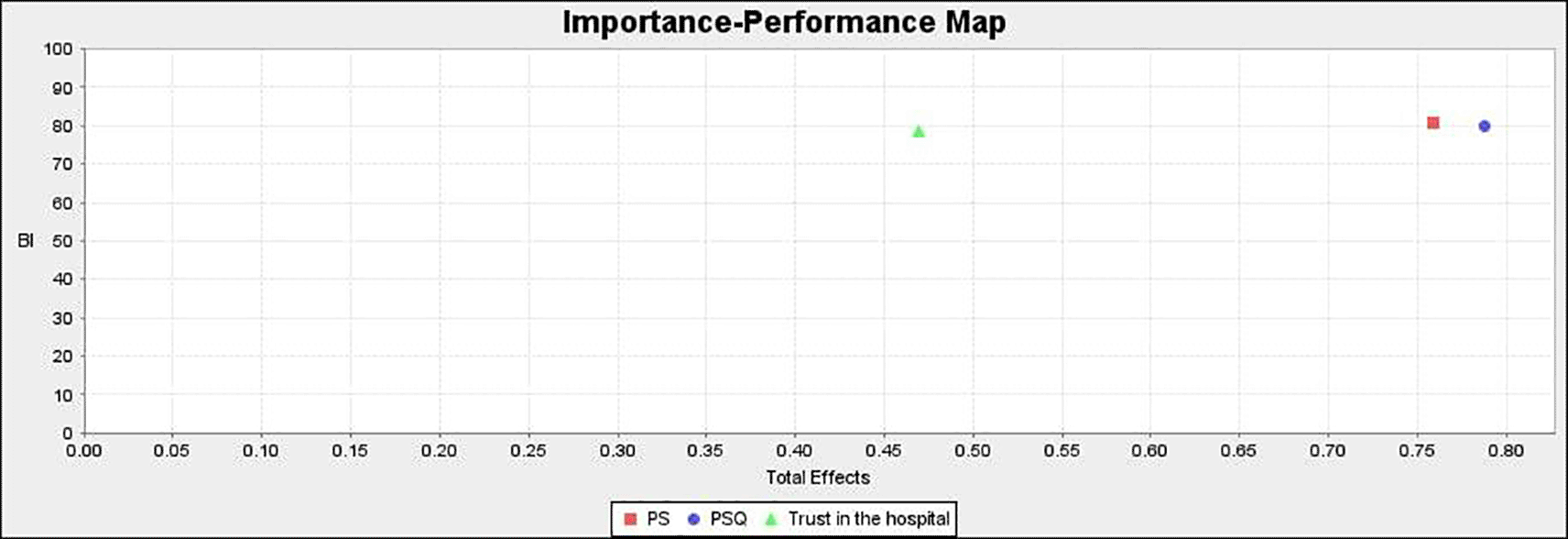 The next hypothesis states that trust in the hospital is significantly associated with BI. Past studies have explored the relationship between trust and BI in the marketing domain.26,30,49,73 Past empirical research recommended that trust is essential to establish BI, especially in service sectors.46,75,76 Scholars have suggested that building trust in any institution results in repeat business.29 Last, the researchers hypothesized that trust in the hospital acts as a mediator between PS and BI. Scholars have observed that trust plays a mediating role in service entities.50,77,78 Trust is exhibited as a mediator between perceived quality and intent to visit for medical treatment.16 IPMA determines that the performance of the construct PS is higher than the other exogenous constructs concerning BI. Trust in the hospital is low on performance. Therefore, it is important to build trust in the hospital and enhance behavioral intent.