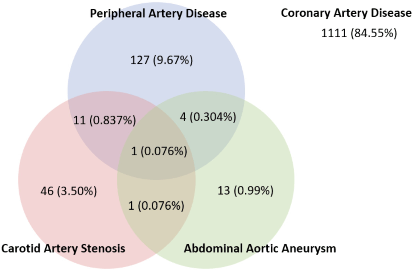 A total of 1314 patients with CAD were identified; 203 (15.4%) patients have vascular disease. All patients had complete medical record data and, therefore, no missing data in this study. Sociodemographic and clinical data are shown in Table 1. Amongst the variables in patient’s demographics, there was a significant difference in the proportion of patients with cerebrovascular disease, CAD three-vessel disease (CAD3VD), and CAD left main disease (CAD-LM). The prevalence of PAD, CAS, and AAA in patients with CAD were 143 (10.9%), 59 (4.5%), and 19 (1.4%), respectively. The overlap between vascular diseases is shown in Figure 1.