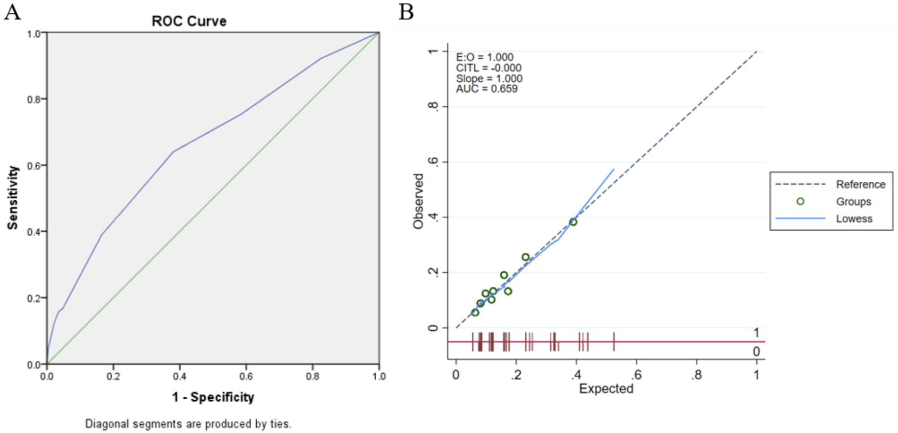 The area under the curve of the model was 0.659 (95% CI: 0.617-0.700) and was well calibrated (Hosmer-Lemeshow test p=0.379;). Using bootstrap validation, the optimism-corrected area under the curve was 0.653 (95% CI: 0.610-0.695), which represents the predictive ability of the model (Figure 2).