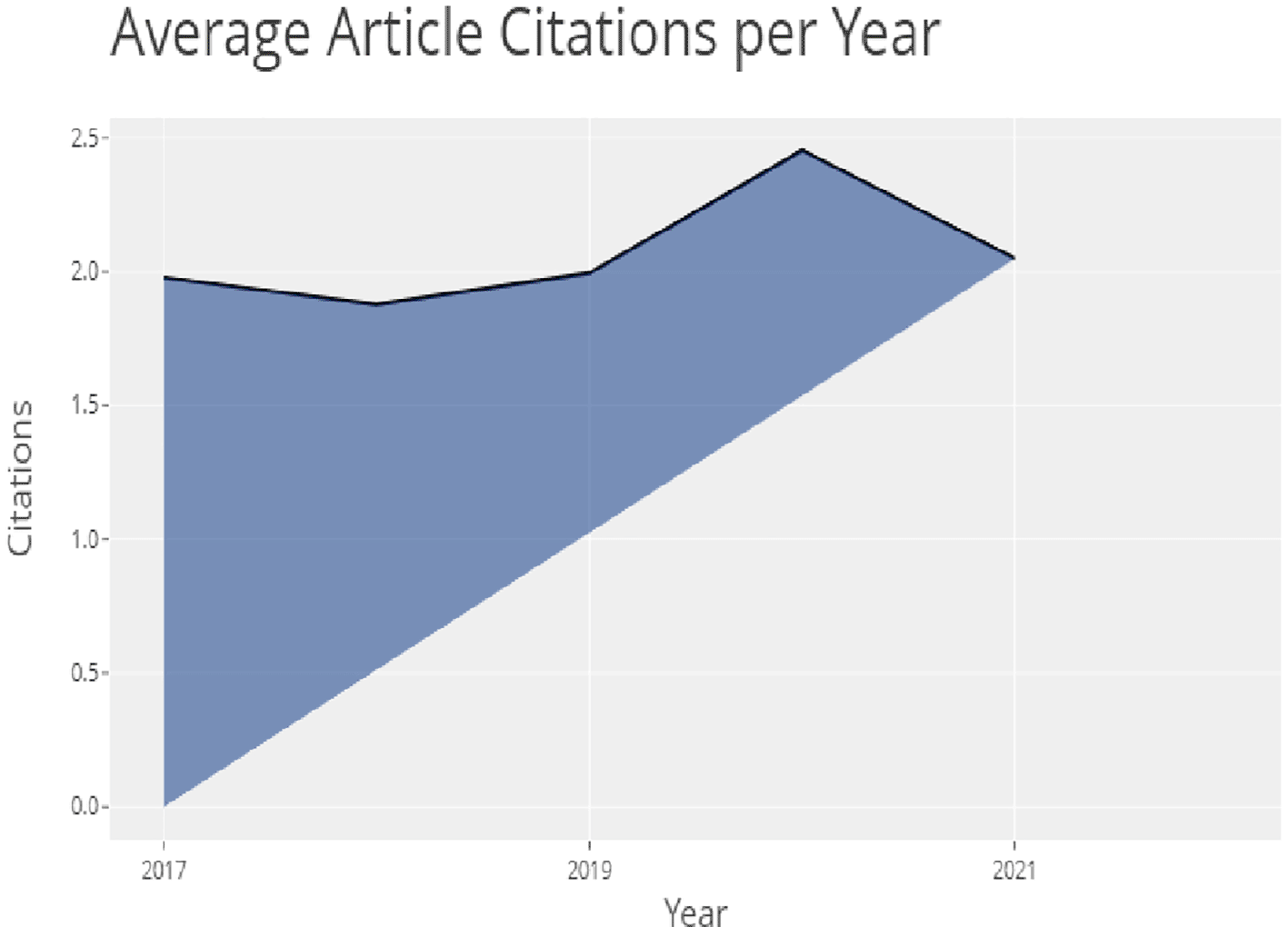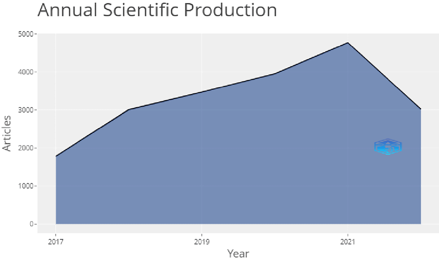 Figure 3 shows the annual scientific production from the year 2017 to 2022.On this figure we can see a sharp surge in the publication volume from 2017 to 2018, as this field of research was gaining importance and was not fully completed i.e it did not reached the stage of saturation. After that, from 2018 to 2019 the topic was still being researched but not with a sharp surge, as the growth rate decreased. From 2019 to 2020 the research was ongoing but not increasing sharply, with a low production on this field, but after 2020 to 2021 again a sharp surge in the publication volume could be seen which eventually decreased from 2021 to 2022.