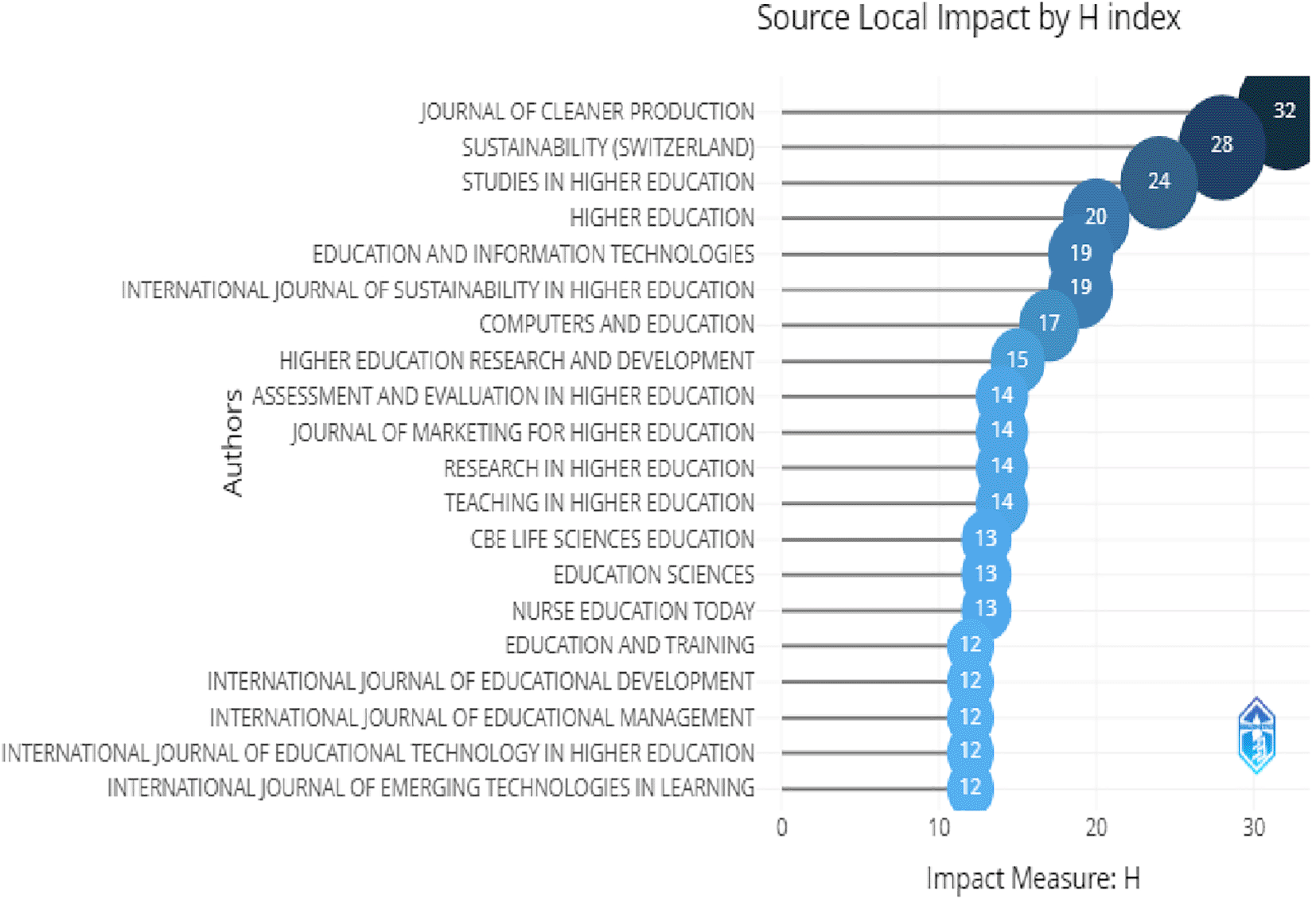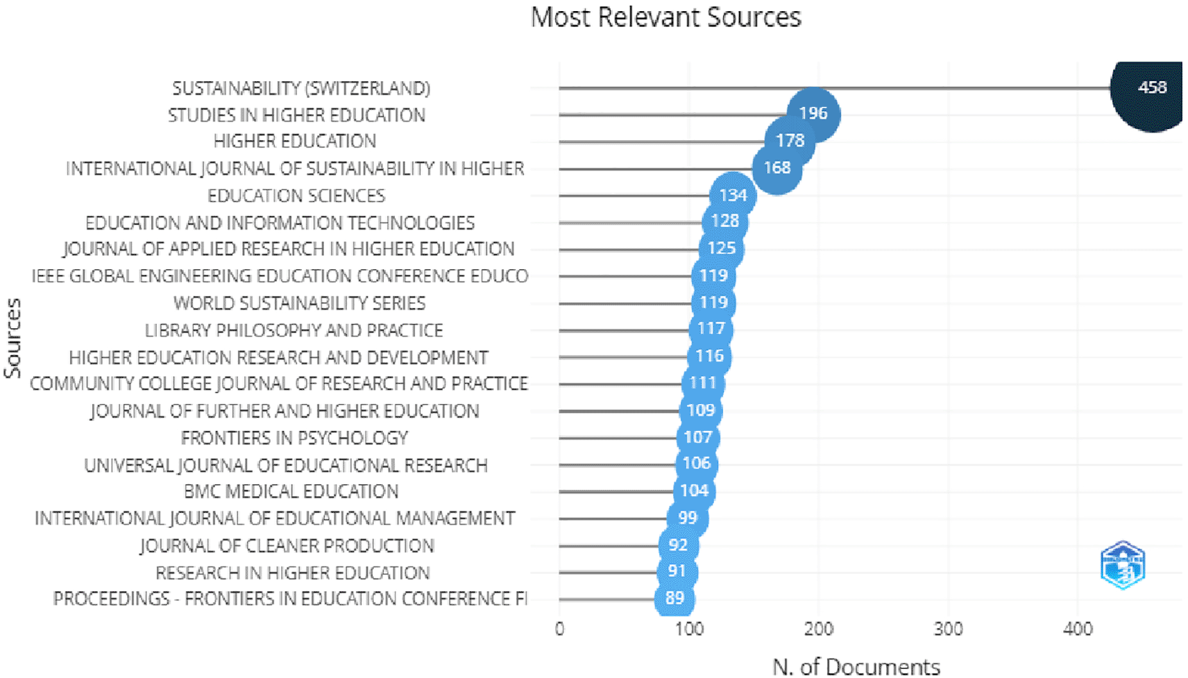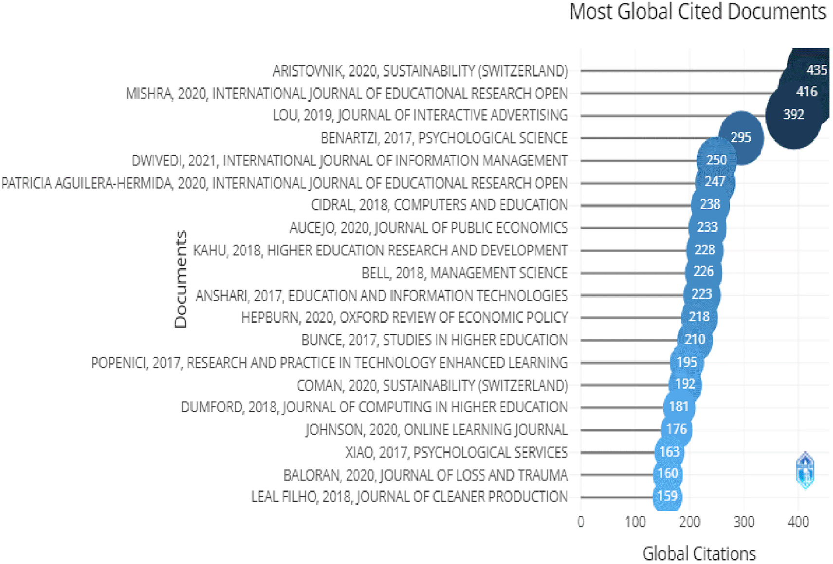 In Figure 4, the top 20 globally most cited documents can be seen. Sustainability, International Journal of Education, Journal of advertising, were at the top of the list. In Figure 5, we can see the most relevant sources in which sustainability, studies in higher education, higher education, international journal of sustainability in higher education are at the top of the list. Looking at this information we can say that most of the words used here were related to higher education, higher education and technology, advertising, information and online learning.