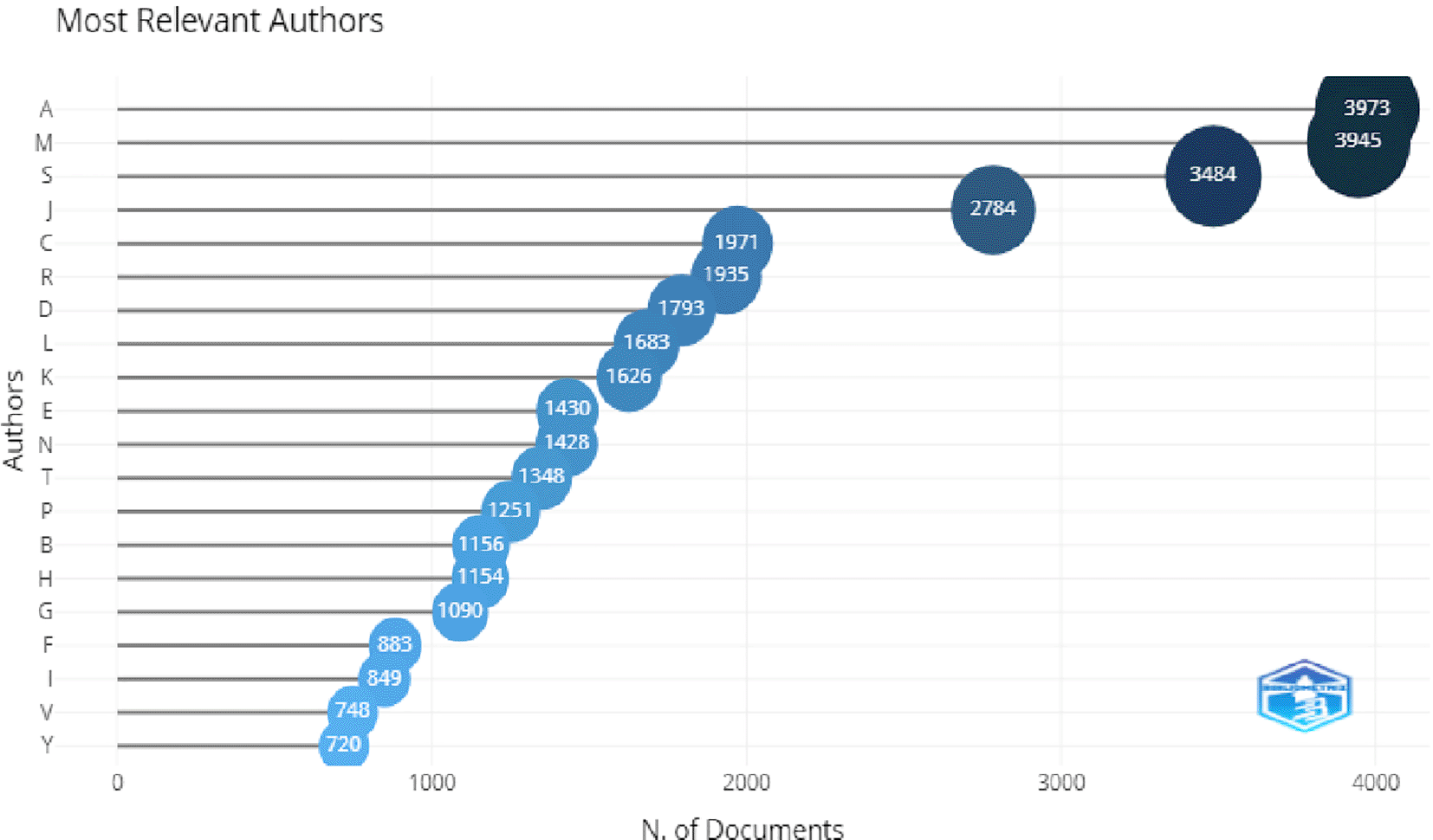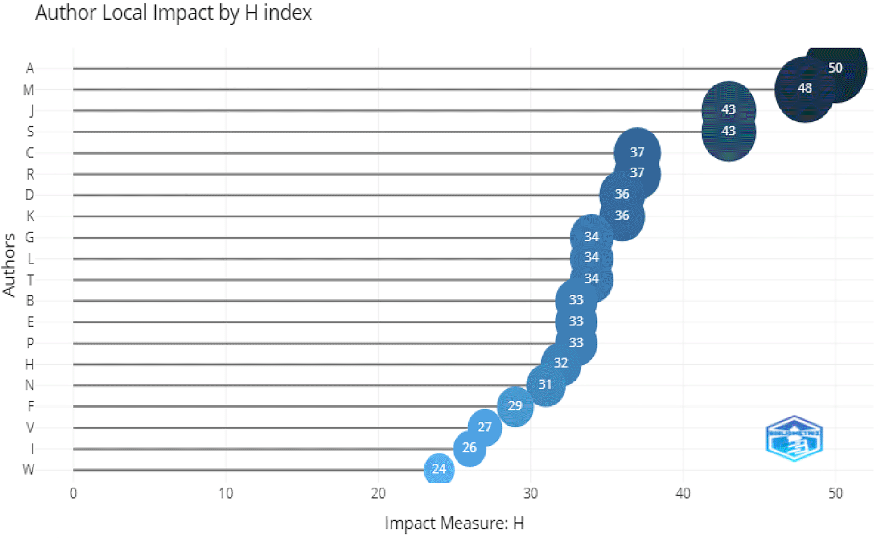 In Figure 7, the top three most relevant authors were A. Aleksander,L. Mishra, and Lou, with the maximum number of publication. The H-index of these authors and citation were also higher, which shows their relevancy. This can be seen in Figure 8.