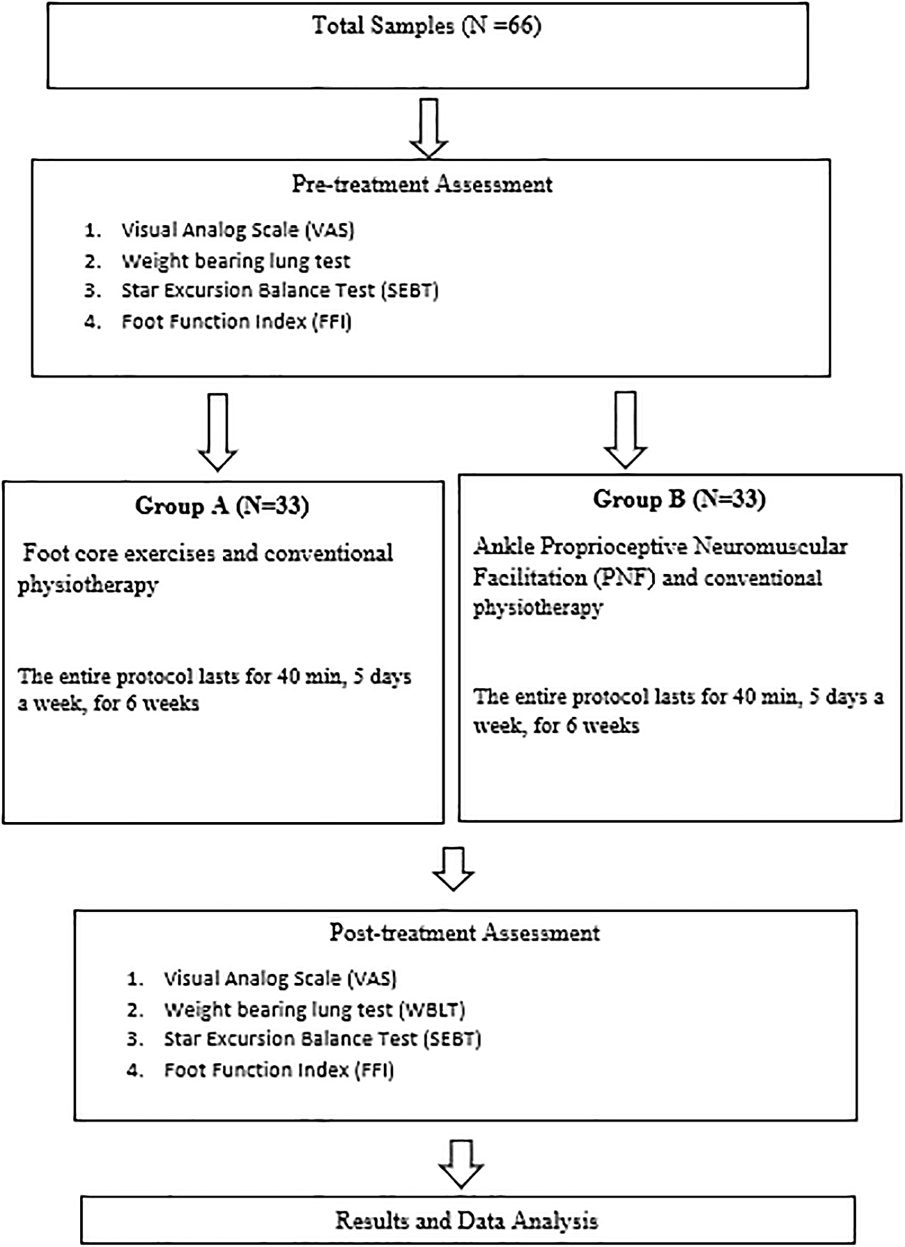 3) To compare the effects of foot core exercises and ankle proprioceptive neuromuscular facilitation on pain (VAS and FFI), range of motion (WBLT), and dynamic balance (mSEBT) in patients with plantar fasciitis.