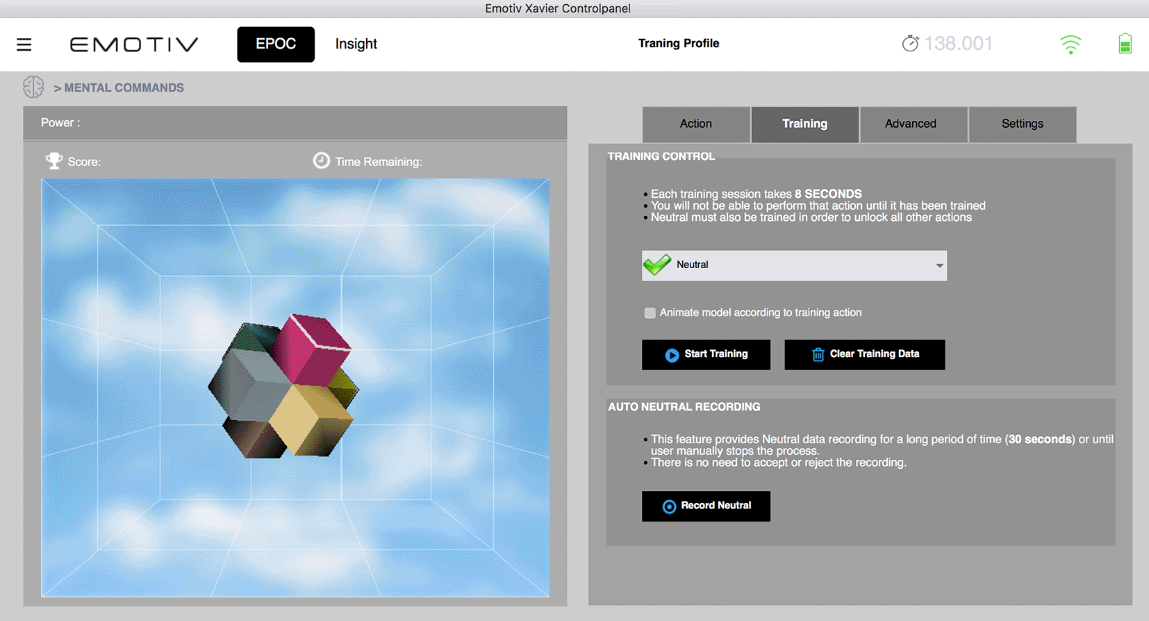 After this initial step, the subjects were asked to train commands using MI tasks. To balance performance and available time, they accomplished each command 10 times. The Emotiv’s manufacturer does not indicate an optimum number of times for training a state, although he advises that the more repetitions are performed the greater will be the system’ ability to recognize trained commands. Indeed, this makes sense since there is a classification model supporting the system. The more data are provided the better the model can generalize, as machine learning models demonstrated.