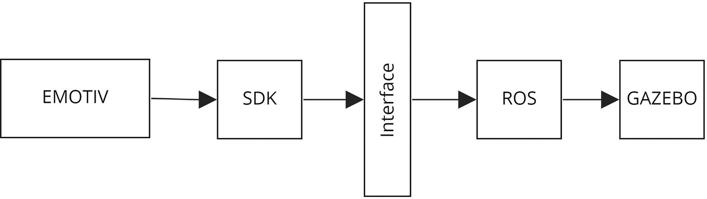 We used the Gazebo to simulate the Turtlebot 3 wheeled robot moving on a virtual environment (Figure 3). To control the robot we used the Robot Operating System (ROS). ROS is a collection of tools, programming libraries, and software design patterns aiming to simplify the elaboration of complex and robust robotic behaviors on a wide variety of robotics’ architectures. We used Emotiv SDK and ROS to develop an interface (Figure 4) that can read subjects’ mental activities and convert them in robot actions. The Emotiv SDK comes with two predefined commands, Push and Pull, plus the Neutral state. We configured the Push command to move the robot forward, the Pull command to spin the robot around itself, and the Neutral state to stop the robot.