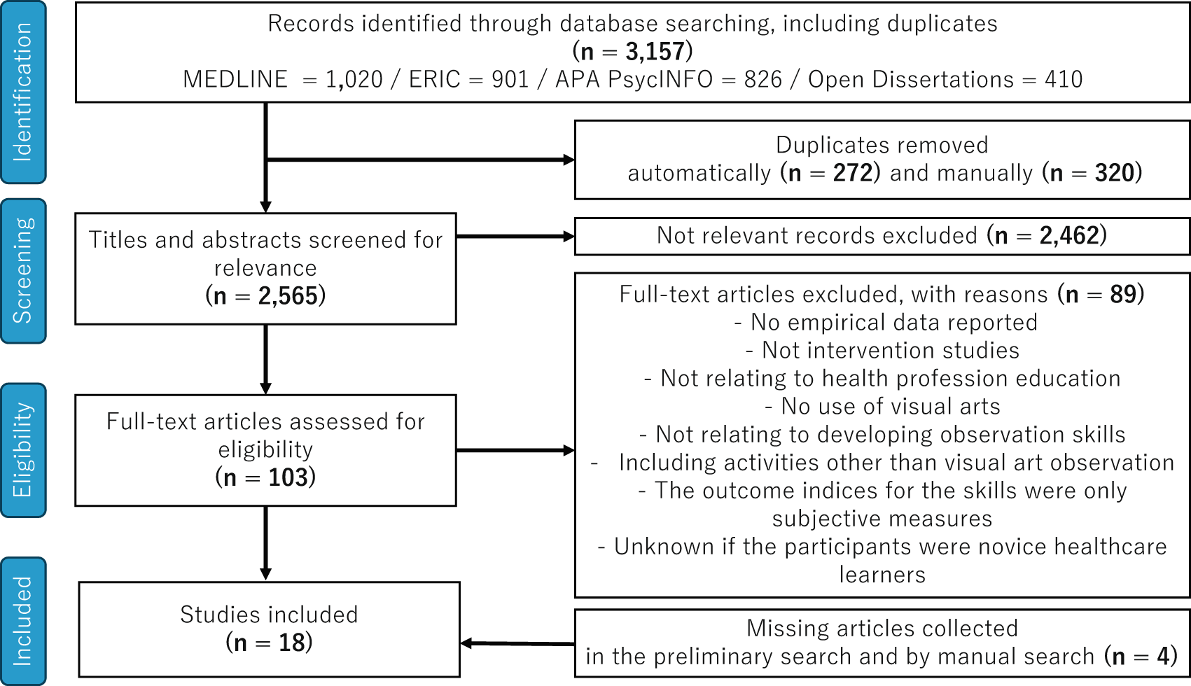On the other hand, studies were excluded if: (i) the full text could not be obtained; (ii) the main text was written in other than English; (iii) review articles; (iv) intervention studies that used visual art but do not aim to develop observation skills; (v) interventions included other activities, except for pre- and posttests, such as drawing or creating visual arts and observing medical images; (vi) studies on “graphic medicine,”39 that used comics included written dialogues; (vii) outcome measures for the skills were only subjective measures, irrespective of the method used (e.g., participants’ subjective evaluation of their skills, their free comments on the interventions, and scales of their impressions of the interventions), (viii) studies that extracted key concepts from the participants’ comments, such as thematic analysis,40 because they are not suitable for determining the learning effects for the entire concerned population since the concepts are identified from the comments of only a few participants, or (iv) the participants were not novice healthcare learners, or it is not clear that they were.