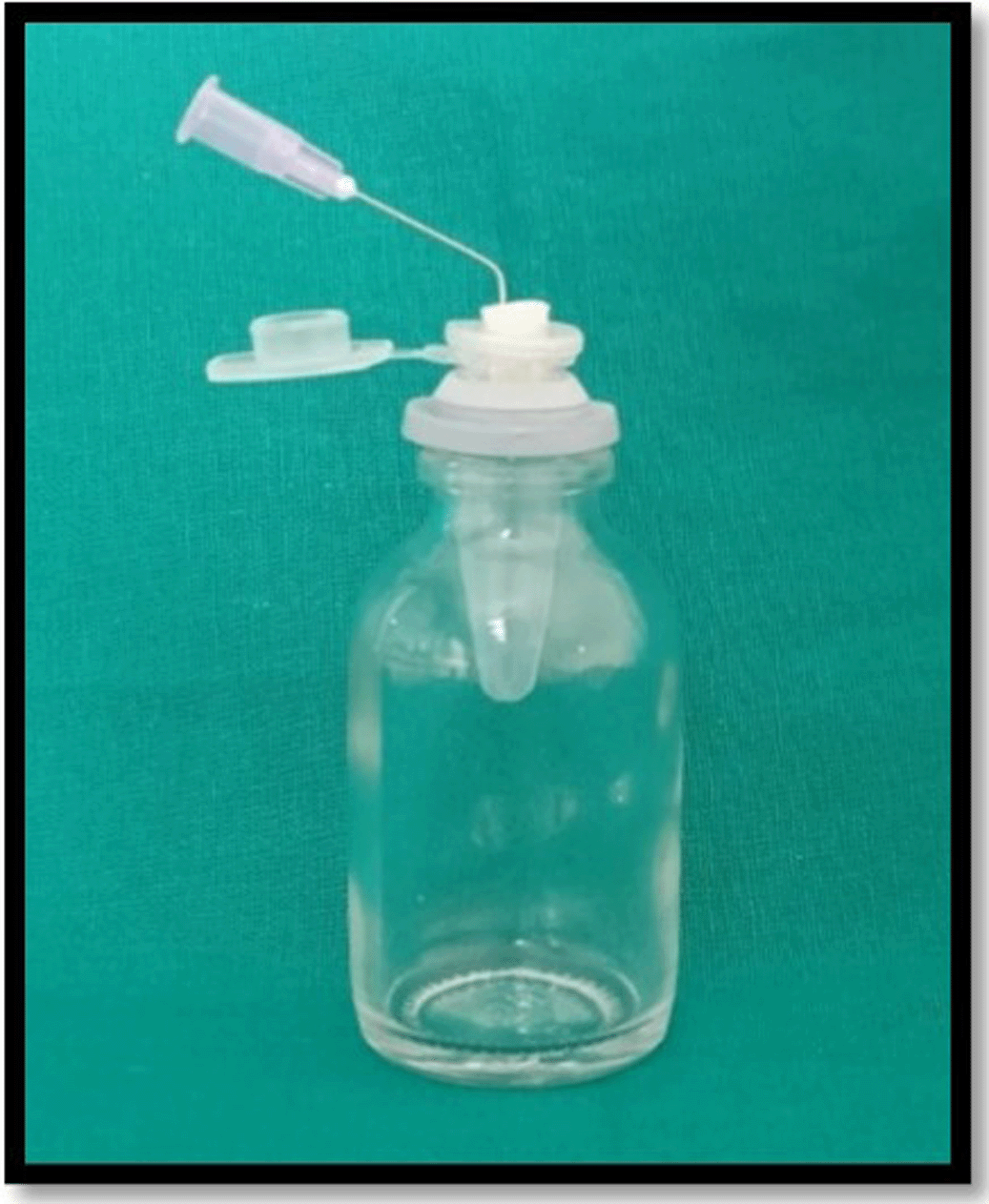 The debris collection apparatus was set up in accordance with Myers and Montgomery’s study 19917 (Figure 1). For collecting the apically extruded debris throughout instrumentation, the Eppendorf tubes were used. A total of 60 tubes were preweighed on an analytical electronic microbalance of 10-6 g precision (Sartorius weighing Technology GmbH, Goettingen, Germany). Each tube’s weight was calculated by taking the mean of three consecutive measurements and placed into an empty glass vial. The teeth were forced into an Eppendorf tube after the preparation of the standard access cavity. Each Eppendorf tube was fitted in the empty vial through the rubber stopper. The apical portion of the samples were suspended in the Eppendorf tube. For equalization of the air pressure inside and outside the tubes, the tubes were vented by inserting a 24-gauge needle along the side of the stopper. When the canal instrumentations were performed, the vials were coated with a dental dam sheet so as to prevent the operator’s view of the tooth’s apical portion (Figure 2). In order to assess debris extrusion, another examiner was blinded regarding different groups.