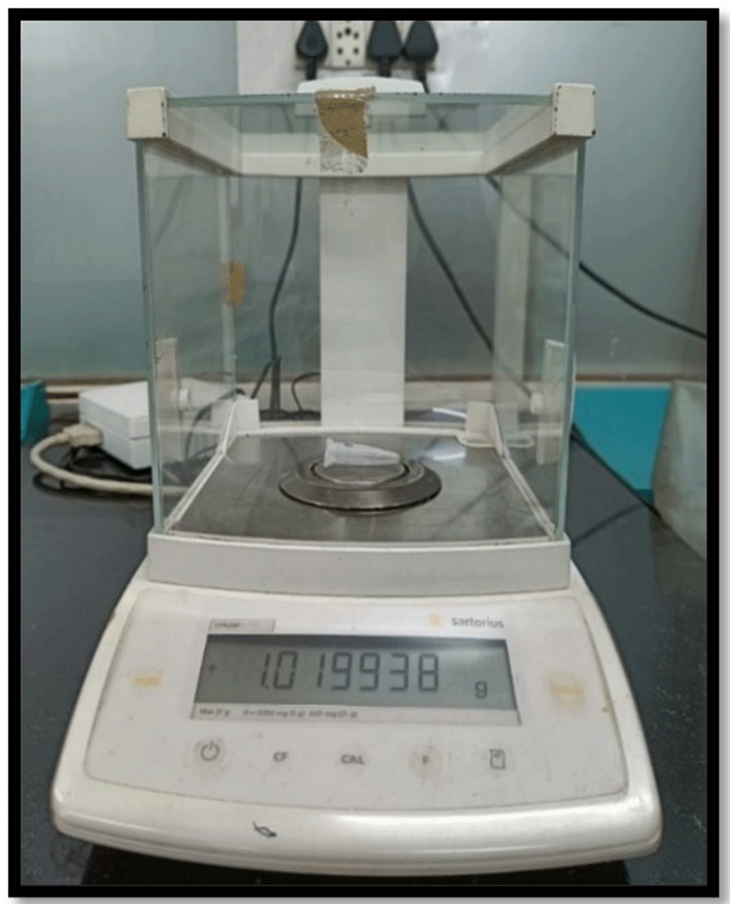 Post-instrumentation, each sample was removed from the Eppendorf tube. To collect the root surface-adhered debris, the root’s apical portion was washed with 1 mL distilled water in a tube. Then, these Eppendorf tubes having debris, extruded irrigants and distilled water were locked with the lid. The tubes were further stored at 140° in a Hot Air Oven for five hours. This led to evaporation of the moisture, obtaining dry debris. An electronic microbalance (10-6 g precision) was used to weight the dry debris and was repeated three times by the same operator, and the average reading was noted (Figure 3). For the assessment of final weight of dry extruded debris in each tube, the mean pre-instrumentation weight of the tube was deducted from their mean post-instrumentation weight. All three groups were compared. The results were statistically analysed.