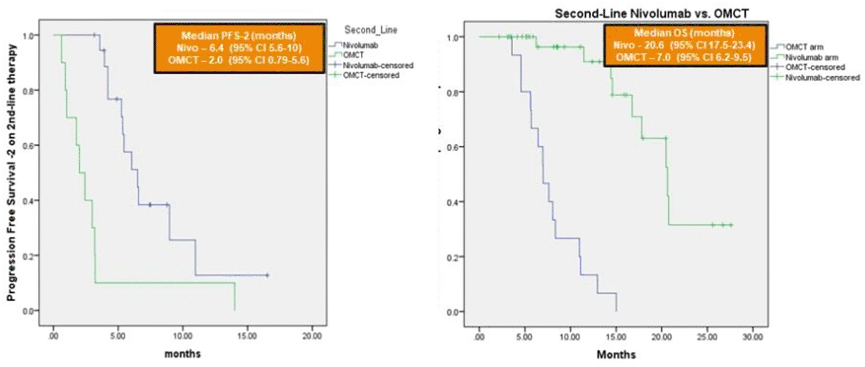 The best response after second line therapies is summarized in Table 3. The ORR was 26.3% with nivolumab and 10% with OMCT. Median PFS and OS after second line therapy were 6.5 months and 20.6 months with nivolumab, whereas 2 months and 7 months with OMCT, respectively (Figure 2).