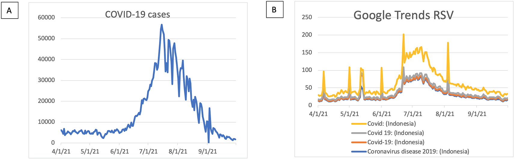 The trend of the COVID-19 case based on “Our Worlds Data” was seen in Figure 1A. The pick of COVID-19 cases sharply increased during June 2021 and was seen to have a downtrend after August 2021. In terms of COVID-19 cases using GT RSVs, we used four keywords of “Covid”, “Covid 19”, “Covid-19”, and “Coronavirus disease 2019” used to search the coronavirus-related terms (Figure 1B). We found a similar trend in that the COVID-19 case increased after June 2021 and decreased after August 2021.