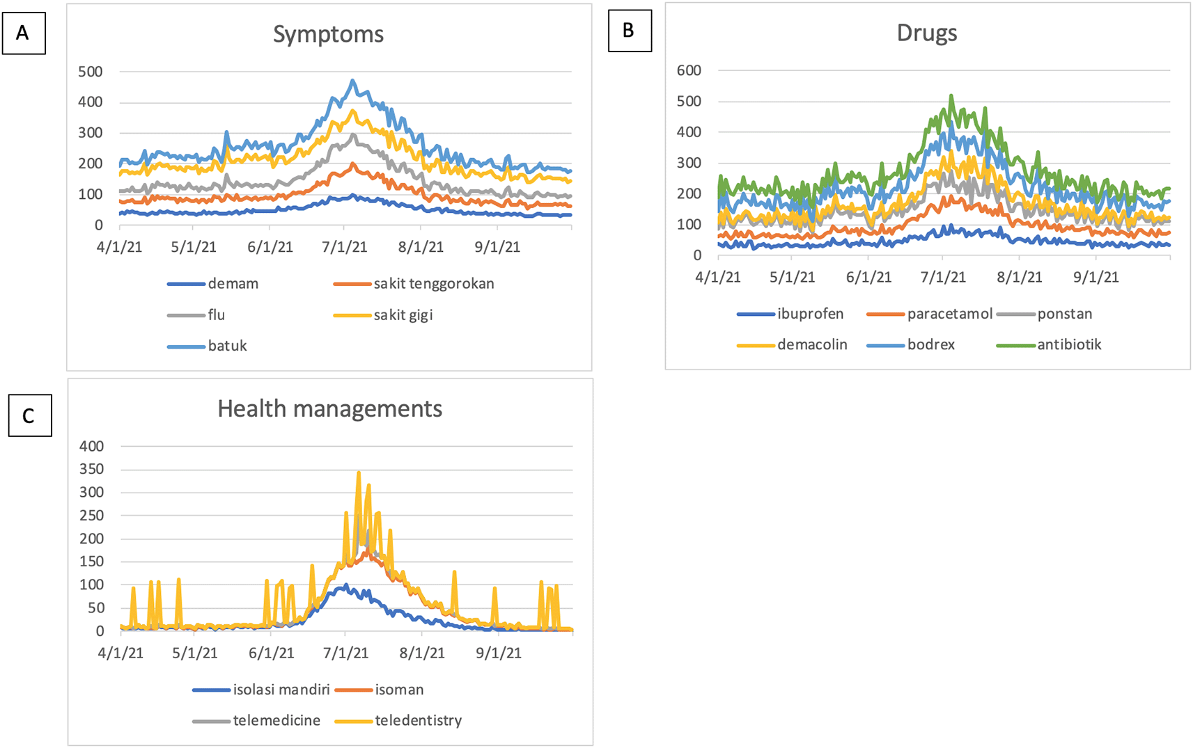 (A) Symptoms-related search terms; fever (In: demam), sore throat (In: sakit tenggorokan), flu (In: flu), toothache (In: sakit gigi), cough (In: batuk). (B) Drugs-related search terms; ibuprofen, paracetamol, ponstan, demacolin, bodrex, antibiotic (In: antibiotik). (C) Health managements-related search terms; self-isolation (In; isolasi mandiri or isoman), telemedicine, teledentistry. RSV = relative search volumes.