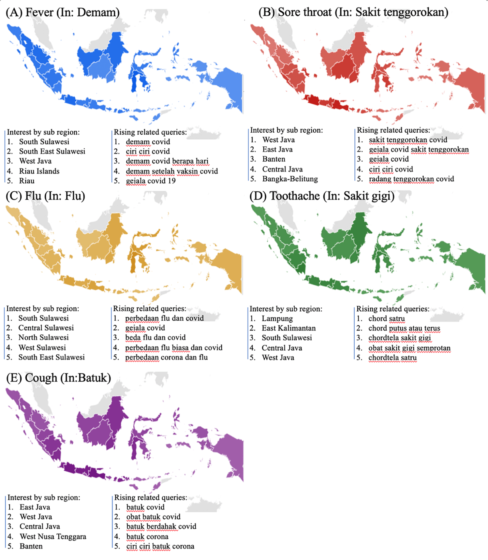 The symptoms-related search terms including fever (In: demam), sore throat (In: sakit tenggorokan), flu (In: flu), toothache (In: sakit gigi), and cough (In: batuk) were seen in Figure 2A. The RSVs curves showed increased trends during the COVID-19 uptrend period between June, 2021 and August, 2021. The top five interest by sub region of those symptoms mentioned above were depicted in Figure 3A-E.