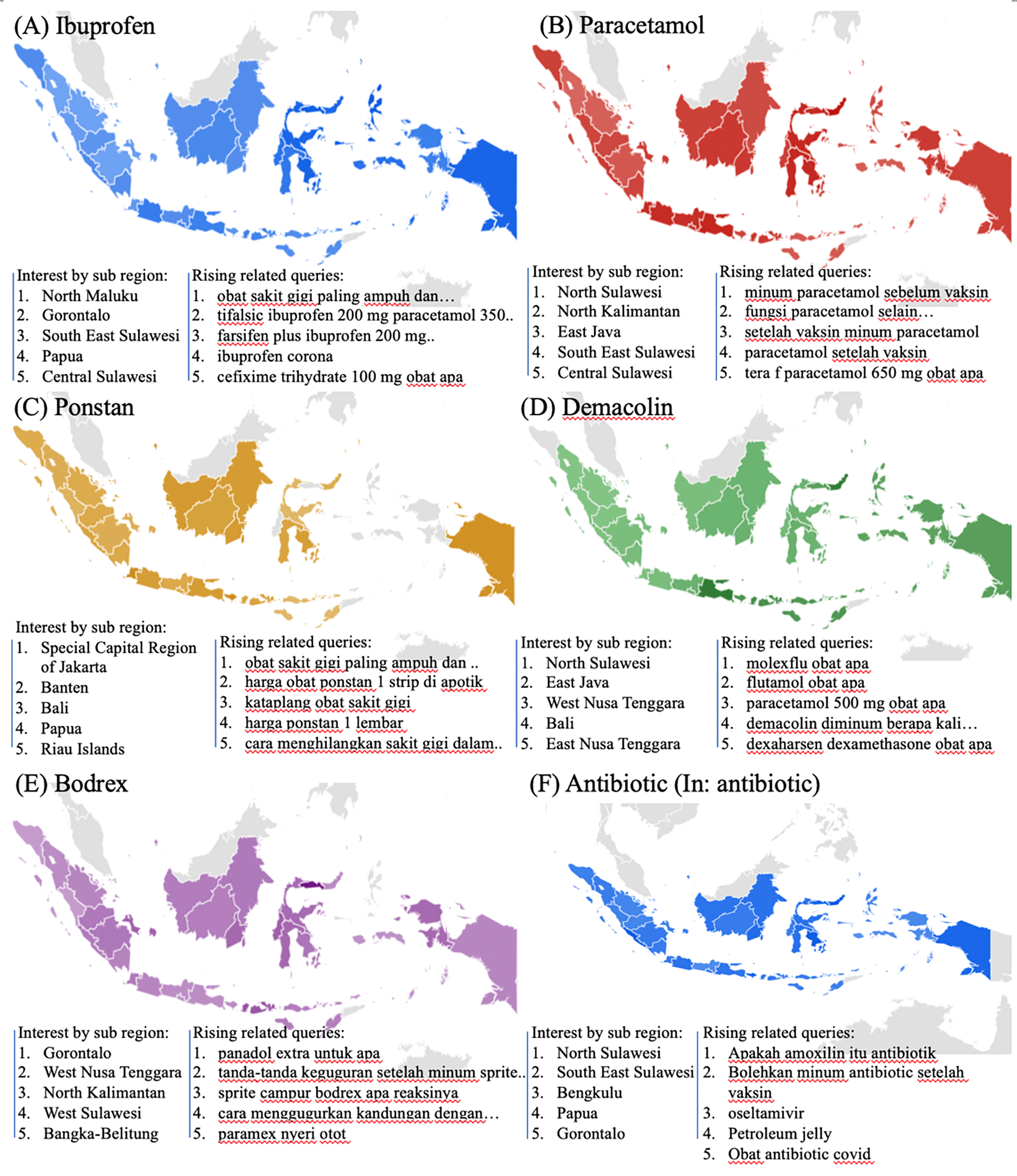 We examined the search interest related to drugs used during the COVID-19 pandemic. As seen in Figure 2B, there were six drugs that were commonly used during the COVID-19 pandemic (ibuprofen, paracetamol, ponstan, demacolin, bodrex, and antibiotic). Interestingly, those six drugs have shown to have a similar trend that increased during June 2021 and was down after August 2021. Figure 4A-F showed the top five sub-regions related to the drugs-search terms.