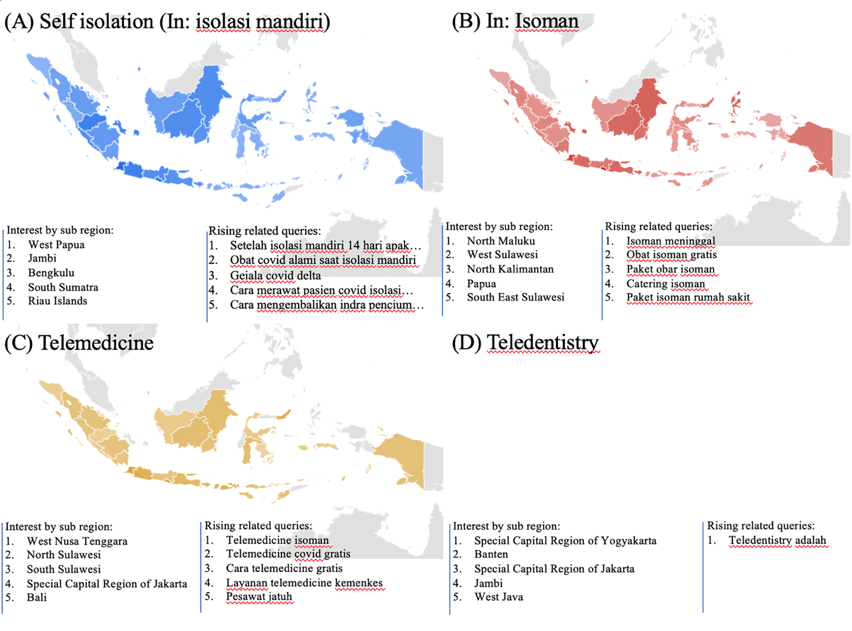 During the COVID-19 lockdown, RSVs curves revealed a rise in interest in terms associated to health management, including telemedicine, teledentistry, and self-isolation (In: isolasi mandiri or isoman) (Figure 2C). Figure 4A–D listed the highest five searches by sub-region. The heat map in Figure 5D, however, could not be created due to little of data.