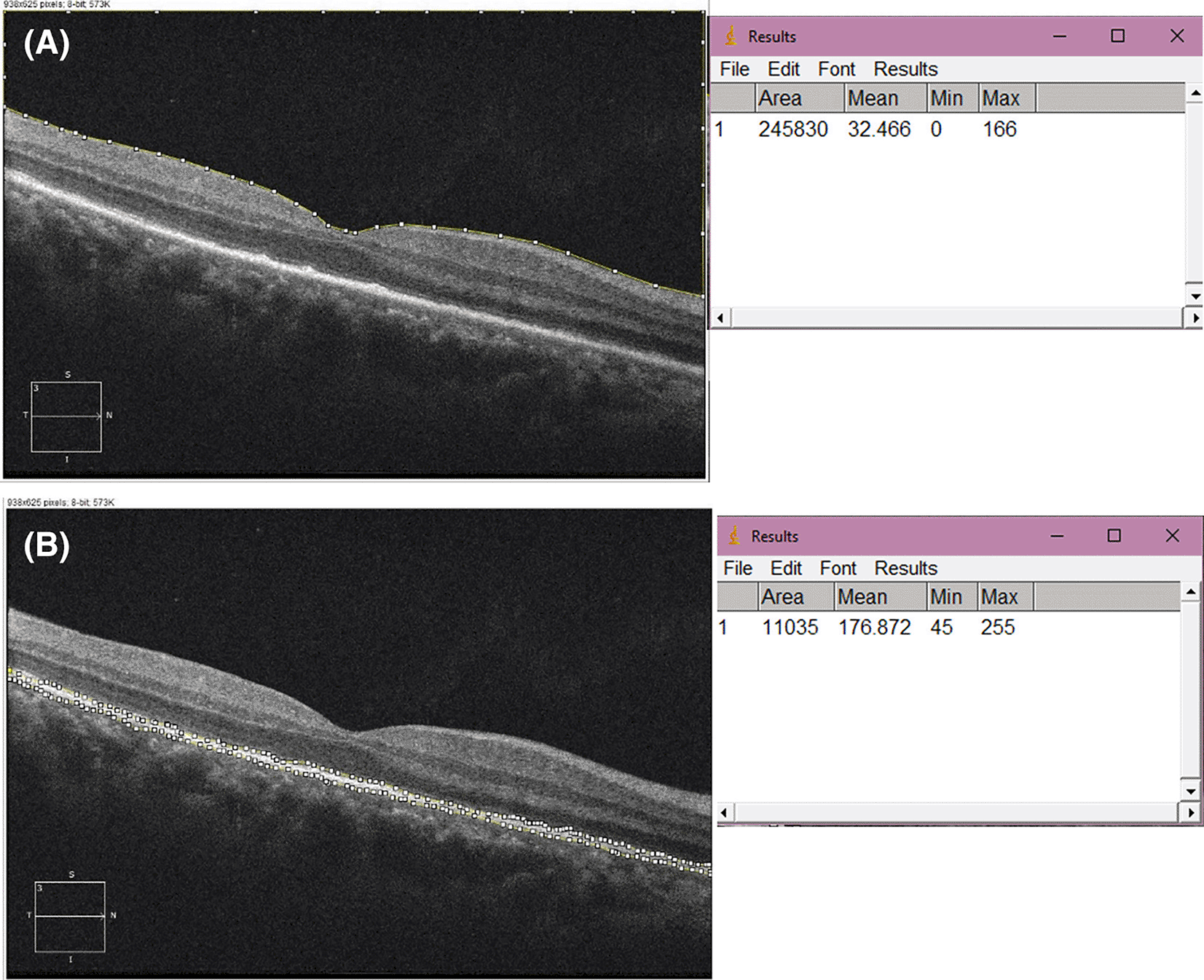 Figure 1. (A) Manual segmentation using ImageJ of vitreous area using polygonal tool in uveitic eye and the mean value obtained. (B) Manual segmentation of RPE area in uveitis eyes and the mean value obtained (VIT/RPE-relative intensity = 0.18).