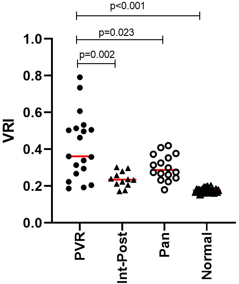 Figure 2. The mean difference of VIT/RPE-Relative Intensity (VRI) of PVR, Uveitis (Int-Post=intermediate-posterior), pan (panuveitis), and normal eyes.
