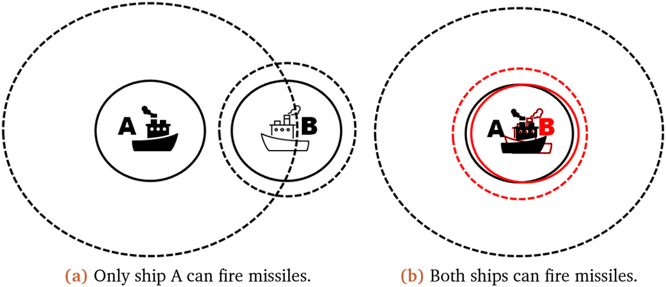 It is shown in Figure 2a that only one ship (A) can fire missiles at the target ship (B). Thus ship A options can be listed as: it sees ship B, it does not see ship B; leading to ship A being able to fire and not fire its missiles, which would lead to an updated missile count for fire as M − m and not fire as M. We can summarise the missiles left for ship A with an interval [M − m, M]. It is important to note that if ship A does not exist, the outcome is equivalent to not firing the missiles as the argument is if the ship does not exist, then it cannot detect ship B, thus it will not be able to fire missiles. The other ship, Ship B, is the one that is getting fired upon by ship A, tracks the number of missiles h that have hit it. If the number of missiles that have hit the ship is zero, then the total number of hits remain unchanged at H (also true if ship A does not exist and so (ship A) does not have the capacity to fire missiles), otherwise the number of hits is H + h. Thus the total number of hits can be represented as [H, H + h]. As mentioned before, a ship’s existence is tied to the number of certain hits it has taken, which means that ship B will not sink as long as the existence of ship A is uncertain or the missiles are fired into the uncertain radar range of the attacking ship.
