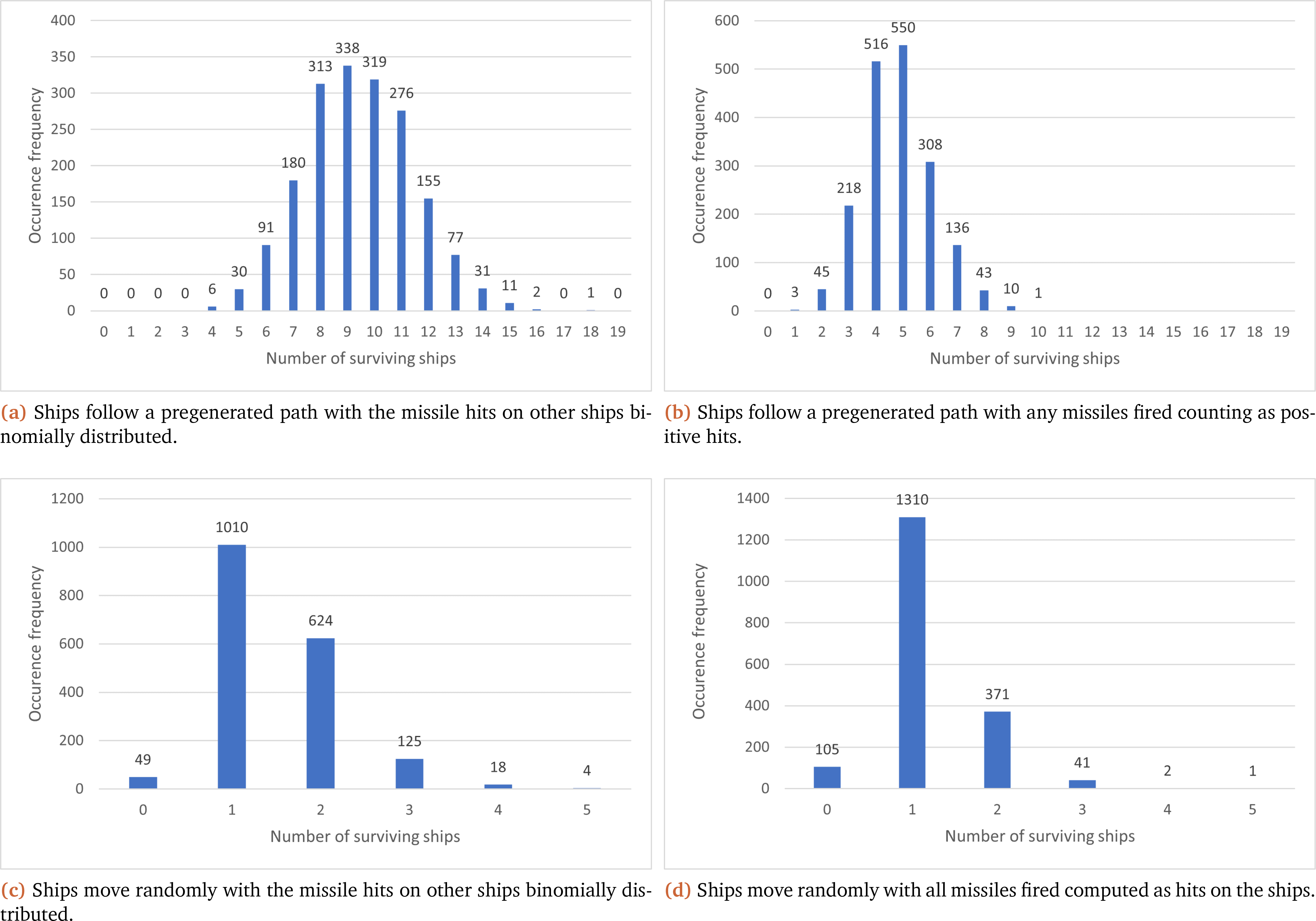 In this vein, as multiple iterations of the model are necessary for MC, there is additional data generated compared to the interval implementation (see endpoint results: Table 2), which can be collated to show the total number of occurrences for the number of ships that survived at the end of the simulation. This can be seen in Figure 3, where each sub-figure corresponds to one of the four previously discussed scenarios. Sub-figures (a) and (b) show that a predetermined path has a higher frequency for the number of surviving ships (with peak occurrence values at nine and five respectively) compared to their associated random path scenario (where both peak values are at one ship). Figure 3 also shows that the paths that the ships follow in the simulation have the greatest effect on the shape of the results; with a preset path ((a) and (b)) displaying results similar to a normal distribution, while a random path ((c) and (d)) coincides more with our expectations (one ship surviving and more ships surviving being less common). Another common factor shown in Figure 3 is that the number of surviving ships at the end of the simulation is higher when they are binomially distributed ((a) and (c)) compared to every missile fired hitting the target ((b) and (d)).