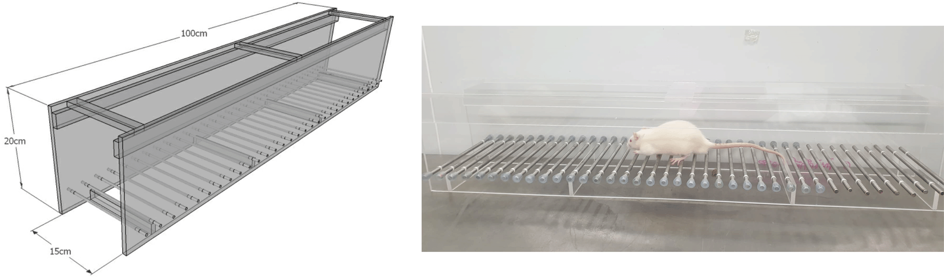 A horizontal ladder rung walking apparatus was used to test the motor coordination between forelimbs and hindlimbs as previously described by Metz and Whishaw.22 All animals spontaneously walked from a beginning point to a goal point along a horizontal rung consisting of 100 × 20 cm clear acrylic walls. The metal rungs created a walking space with a minimum distance of 1 cm between rungs (Figure 1). All animals were trained to cross the ladder for three days before i.p. injection of MPTP. Seven days after MPTP injection, all animals were required to walk across the ladder for assessing motor function recovery. All animals were tested three times per session and the spending time to cross the rungs was recorded.