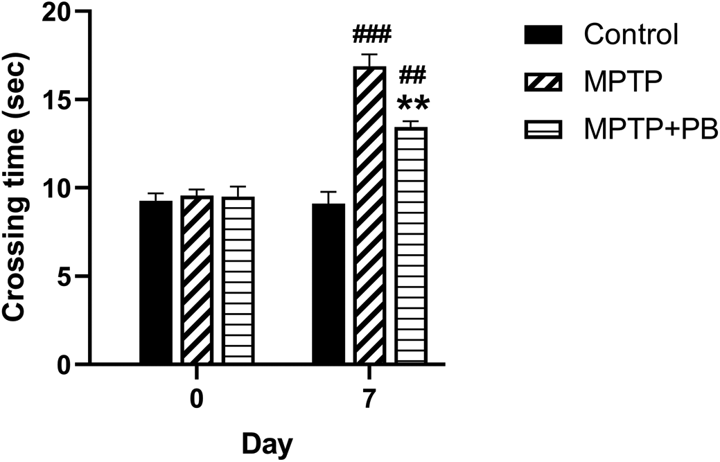 To evaluate the effect of PB on MPTP-induced motor functional deficit, all animals were assigned to walk across the ladder rung apparatus. Prior to MPTP injection at baseline, there were no significant differences in crossing time between all animal groups (Control: 9.27±0.41 s versus MPTP: 9.56±0.35 s versus MPTP+PB: 9.50±0.57 s, Figure 2). Seven days after MPTP injection, the MPTP and MPTP+PB groups showed a significantly increased time spent across the ladder rungs when compared to the control group (Control: 9.11±0.78 s versus MPTP: 16.89±0.88 s versus MPTP+PB: 13.44±0.16 s). The data indicated that administration of MPTP negatively affects motor functions; however, treatment with PB significantly improved motor coordination, resulting in reduced crossing times as compared to the MPTP group (p<0.01).