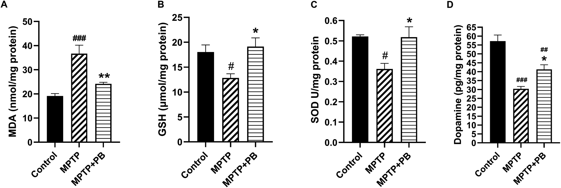 The improvement of motor coordination in PB-treated animals after exposure to the dopaminergic neurotoxin may be linked to an increase in DA levels. Therefore, alterations of DA were assessed using an ELISA kit on day 7 after MPTP injection. Animals injected with neurotoxin (MPTP) demonstrated markedly reduced DA levels when compared to the control group (Control: 57.18±8.43 versus MPTP: 30.34±3.34 versus MPTP+PB: 41.30±6.43; Figure 3D). In this study, PB treatment significantly attenuated the reduction of DA when compared to the MPTP group. These results revealed that PB treatment inhibits MPTP-induced oxidative stress via upregulation of antioxidative enzymes; moreover, PB counteracted the loss of DA which correlated with an improvement of motor coordination.
