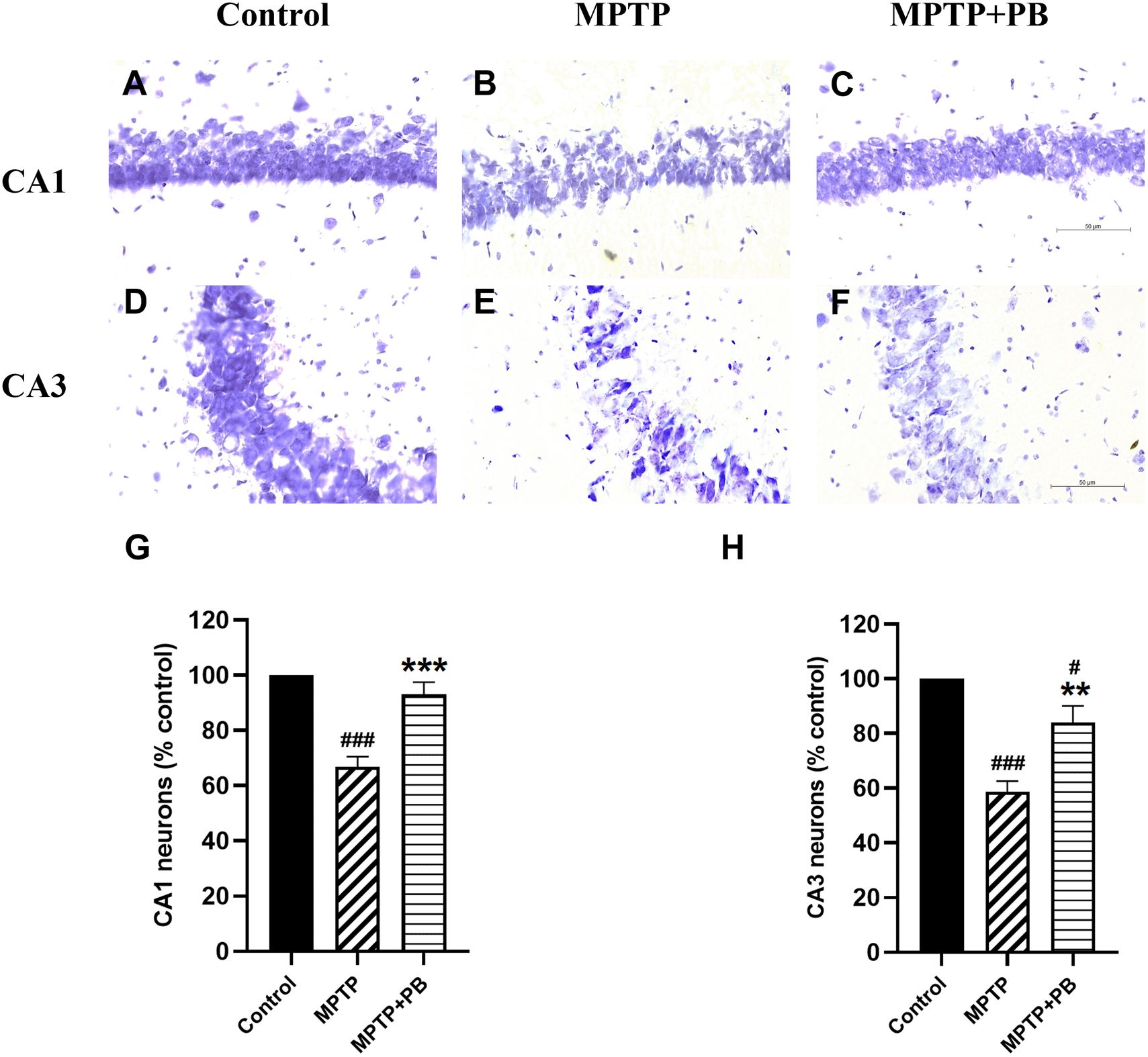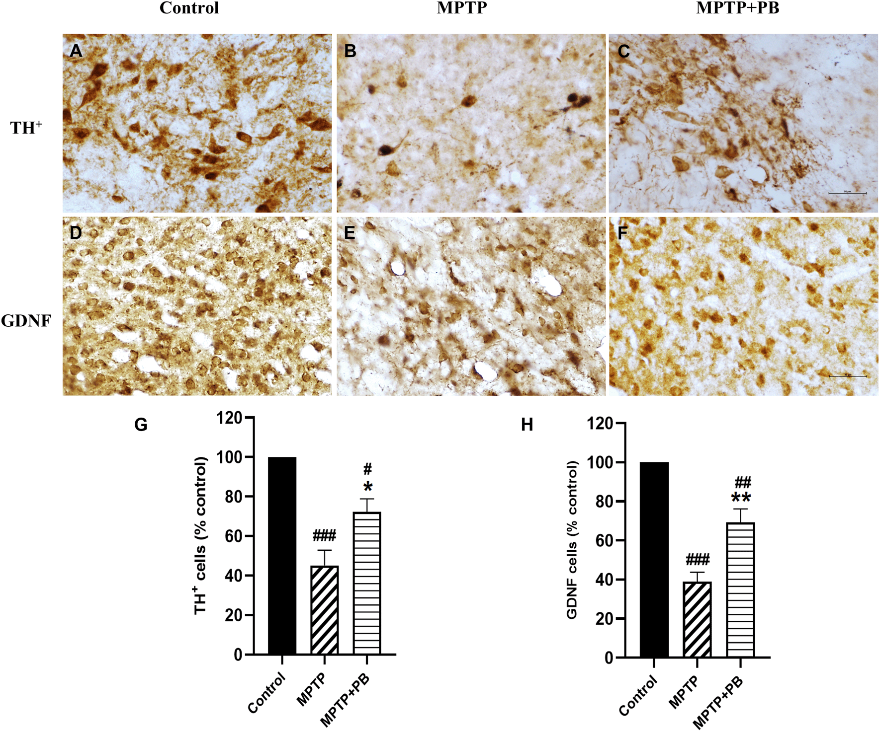 Data were reported as mean±SEM (n=6), one-way ANOVA. #p<0.05, and ###p<0.001 versus control group; **p<0.01, and ***p<0.001 versus MPTP group. Bar=50 μm.