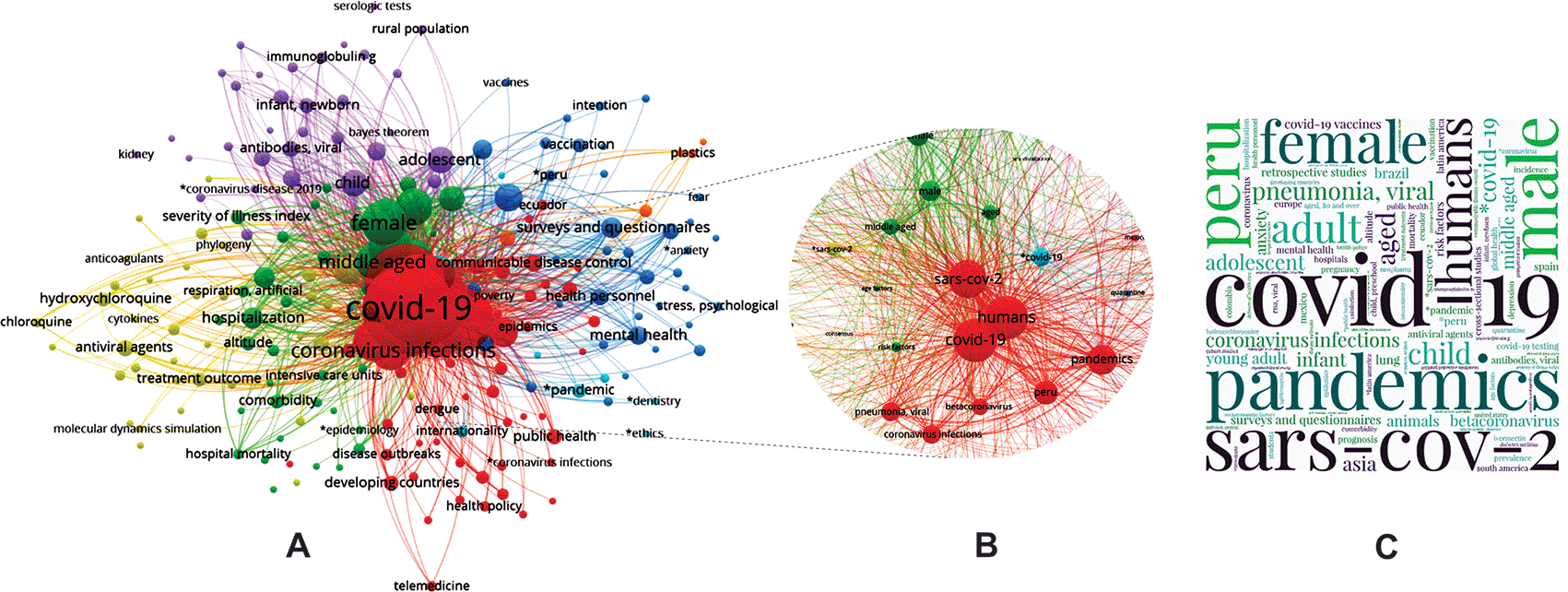 A) Network map built by VOSviewer based on the co-occurrence of MeSH terms. B) Red cluster zoom related to COVID-19 and Peru. C) Word cloud based on the Keywords.