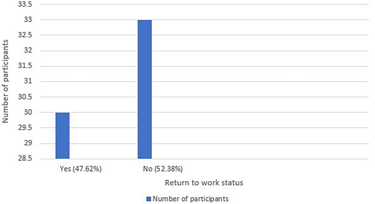 Only 30 (47.6%) of the participants reported, successful RTW after CR and 33 (52.4%) of participants did not RTW, as indicated through answering of questions four and five in the WORQ questionnaire. This was an interesting result in that despite 47.6% of individuals RTW, many of these individuals initially struggled to adapt to their worker roles immediately after completing rehabilitation (Figure 1).
