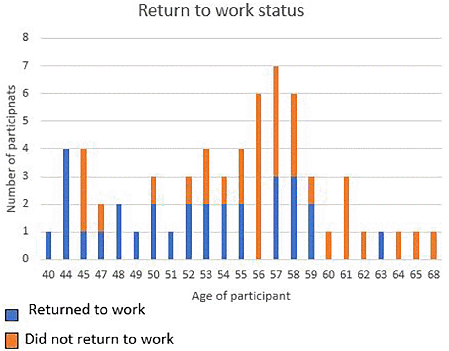 From the logistic regression it was understood that the older you get the less likely you are to return to work after a cardiac incident. As noted in the figure below, most of the participants in the study sample were in the 57-year-old age group and did not RTW. All participants 44 years and below, returned to work (Figure 2).