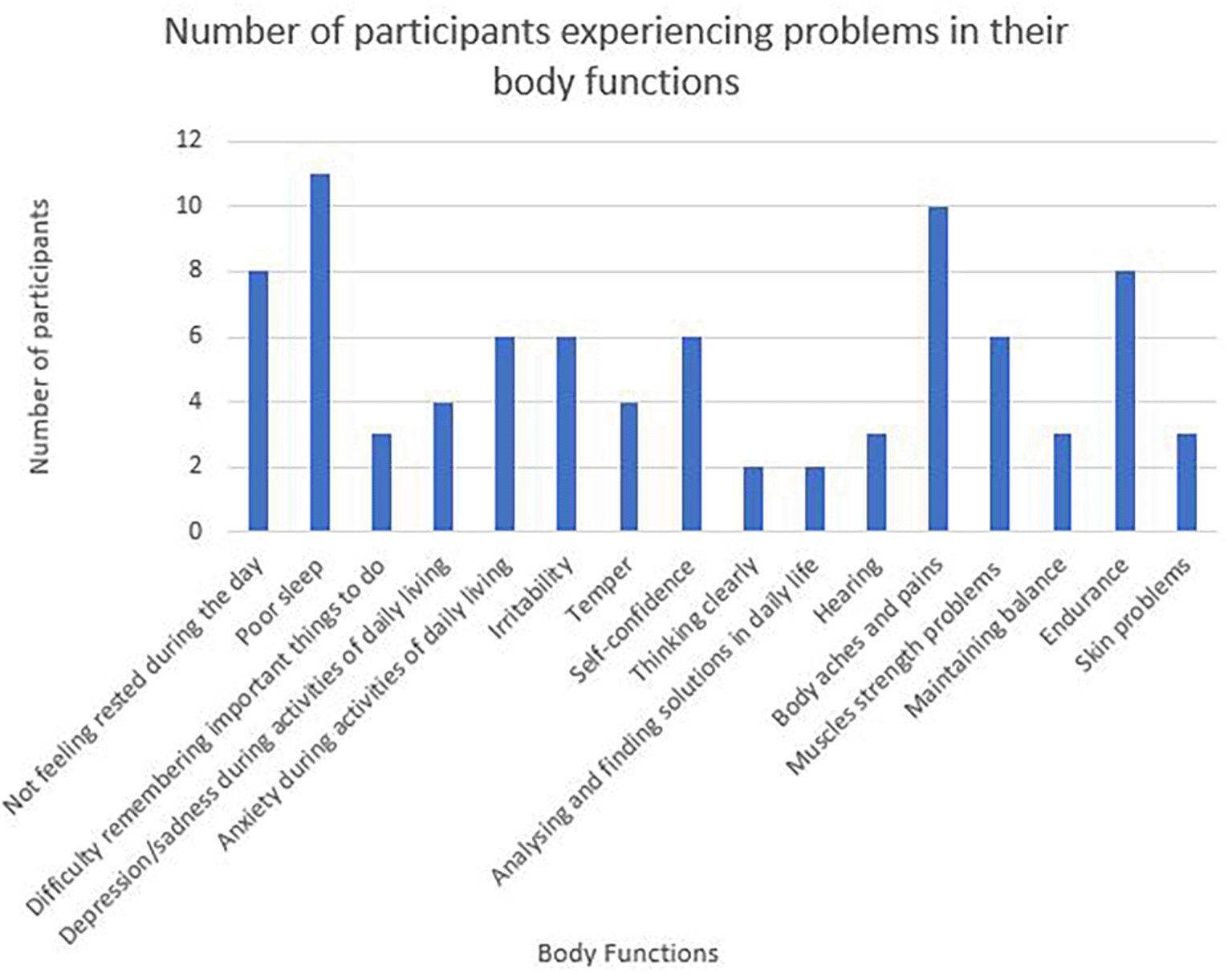 Sixteen categories of body function are represented in the WORQ and Figure 3 below details responses that scored 8-10 on the Likert scale for each category. Problems related to sleep, body aches and pains and endurance rated amongst the highest in the participant responses.