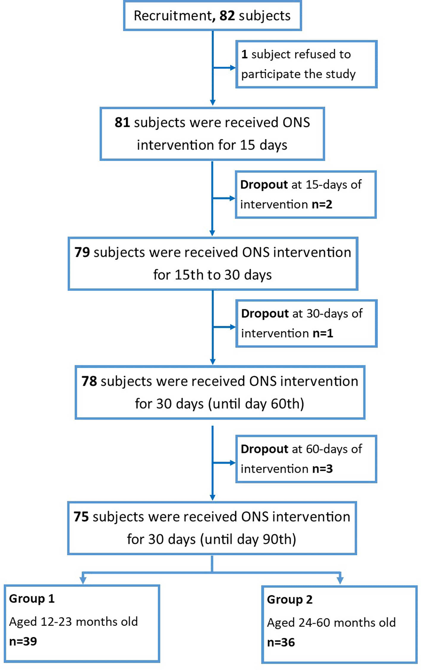 Seventy-five subjects were involved in the study and divided into two groups based on the age of the participant: group-1 (age 1–2 years, n = 39) and group-2 (age 2–5 years old, n = 36), as summarized in Figure 1.