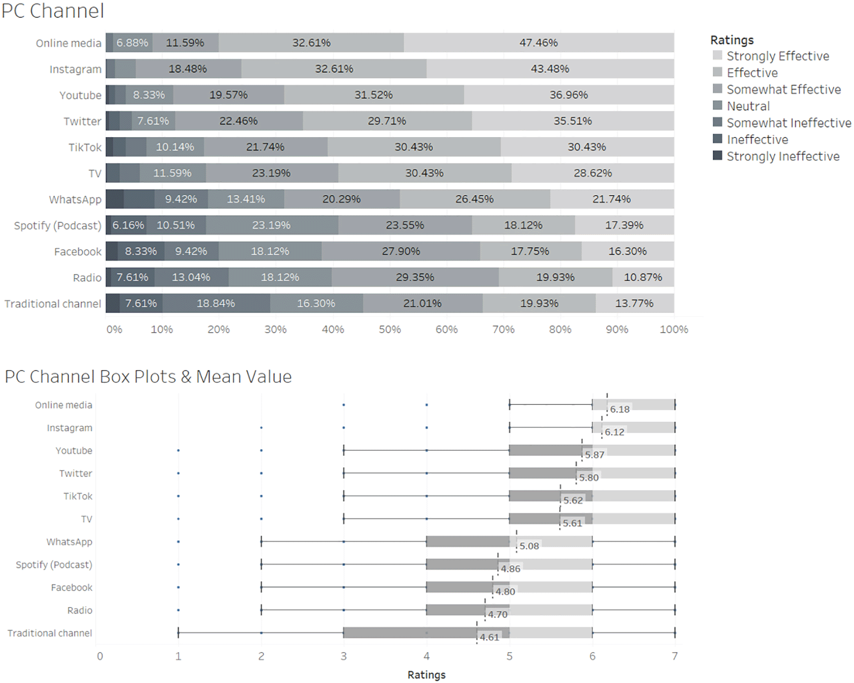 Regarding the channels perceived (Figure 5) as the most effective and beneficial when it comes to information pertaining to OMICRON, Online media (means = 6.18) and Instagram (means = 6.12) are shown to be the highest. YouTube (means = 5.87), Twitter (means = 5.80), TikTok (means = 5.62), TV (means = 5.61), and WhatsApp (means = 5.08) are within the range of 5-6 of agreement by respondents. The channels perceived to be the least effective and beneficial are Spotify (4.86), Facebook (4.80), Radio (4.70), and Traditional Channel (means = 4.61).