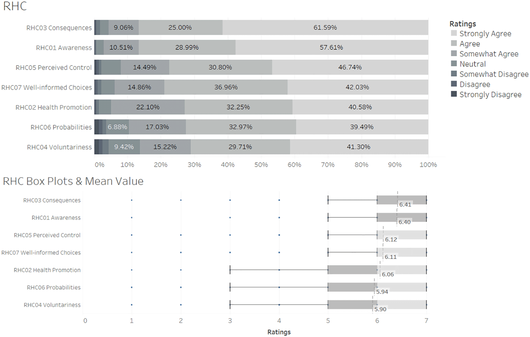 Figure 6 regarding risk and health communication shows that most respondents (61.59%) tend to strongly agree on RHC03 regarding consequence, which is also the highest percentage, while for the lowest percentage is for RHC06 regarding probabilities (39.49%). The rest, an explanation of the findings on this RHC, can be seen in the Table 4.