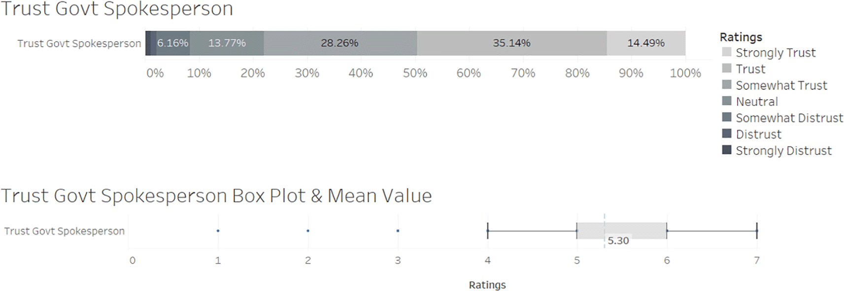 Regarding the extent to which the respondents trust spokespersons from the government (Figure 7), the means (5.30) lie in between “somewhat trust” and “trust.” Most people generally trust the spokespersons from the government (35.14%), followed by those that somewhat trust the government (28.26%).