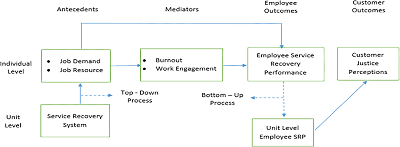 Accordingly, this Study argues that customer justice perceptions, captured at the customer or individual level of analysis, are influenced by employee service recovery performance. In turn, the construct of employee service recovery performance, captured at the employee or individual level of analysis, is influenced by the impact of job demands and job resources exercised through the mediated effects of burnout and work engagement. Furthermore, the individual-level constructs of job resources and job demands are influenced by the unit-level construct of the service recovery system. This relationship among constructs requires capturing the macro-level construct—the service recovery system’s impact on job resources and job demands—before assessing their impact on employee burnout and work engagement.