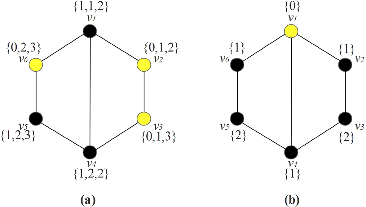 We illustrate this concept in Figure 1. In this case, the m-resolving set is W = {v2, v3, v6}, shown in Figure 1(a). The multiset dimension is md(G) = 3. The representations of v ∈ V (G) with respect to W are all distinct. For the local multiset dimension, we only need to make sure the adjacent vertices have distinct representations. Thus, we could have the local m-resolving set W = {v1}, shown in Figure 1(b). Thus, the local multiset dimension is μl(G) = 1.