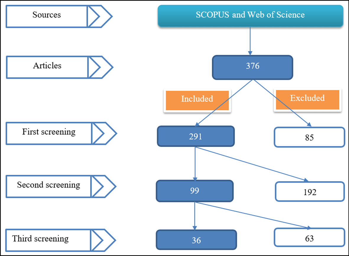 We used Scopus and Web of Science databases to download articles related to the effect of PBL in learning physics. Two main keywords (problem-based learning and problem-based learning in physics) were used. We used Boolean operators to refine our search (eg., problem-based learning AND problem-based learning physics OR PBL physics OR PBL education NOT medical). “AND” includes both or all words we searched, “OR” included results with either word, but not necessarily both words, and “NOT” excluded articles with that word. We excluded “medical studies” because when we searched for PBL, we found many studies in the medical field. An independently trained research assistant was involved in the search phase to ensure the proper article inclusion. The first author and research assistant independently searched related articles in both databases and shared the output. There was no difference in outputs as they shared common keywords. We initially got 1,914 results from Web of Science Core Collection. We quickly filtered out 295 review articles. We excluded proceeding papers, data papers, and discussions among document types. Among the Web of Science categories, we included articles related to education research and physics education. Thus, we refined by research area (articles related to educational research, physics, optics, astrophysics, biophysics, mechanics, physical geography, and thermodynamics) and also filtered out articles written in other than the English language. This resulted in our final selection and we downloaded 311 articles. Scopus database generated 80 document results. After applying the subject area filter, we were able to download a total of 65 articles [Social Sciences (37), Physics and Astronomy (26), Arts and Humanities (2), Earth and Planetary Sciences (1), and Multidisciplinary (1)]. Thus, 376 articles were used in the first screening (see Figure 1).