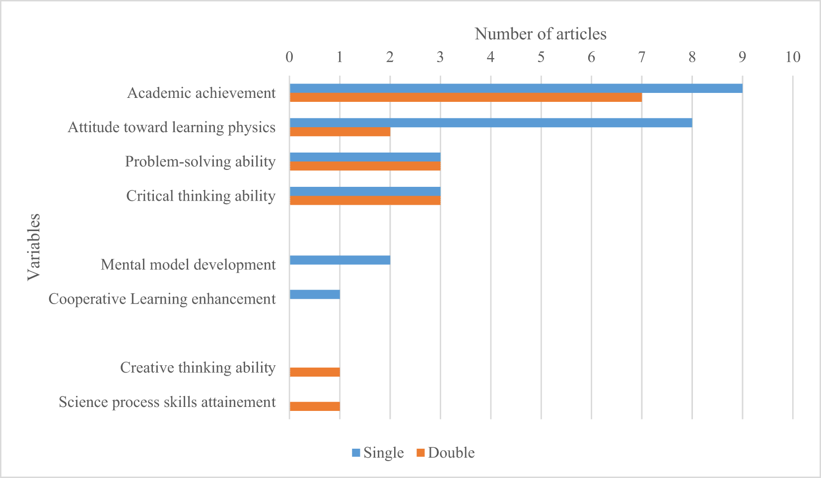 The role of PBL in learning physics varies from improving student academic achievement and motivation (attitude toward) to learn physics to various skills such as critical thinking and problem-solving ability (see Figure 2). “Single” means that only one of the variables on the vertical axis was integrated into a single study. In contrast, “Double” means that such a variable was investigated with another variable in one study. For instance, nine studies investigated academic achievement alone, while this achievement variable was investigated with attitude toward learning physics in four studies, problem-solving ability, critical thinking ability, and science process skills in one study (each). Generally, attitude toward learning physics with PBL was investigated in ten studies (eight studies alone and two studies with academic achievement and problem-solving ability), the capacity of PBL to develop problem-solving ability in six studies (three studies studied it alone while other three studies studied it in the combination of either academic achievement, attitude toward learning physics or critical thinking ability) and critical thinking ability in six studies (three studies studied it alone while other three studies studied it in a combination of either academic achievement, problem-solving ability or creative thinking ability).
