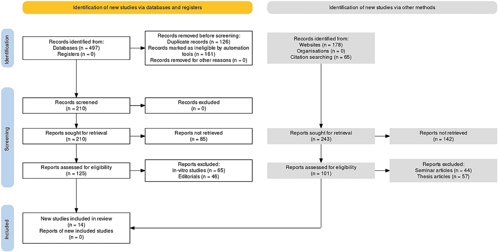 There were a total of 103 documents discovered after extensive search on the online journals and 54 of the papers were selected initially. Following that, 22 similar/duplicate articles were eliminated, which resultantly made 32 separate papers available at first. The abstracts and titles of submissions were then reviewed, and a further 18 papers were eliminated. Finally, 14 documents that met the inclusion and exclusion criteria were chosen, which included study articles and randomised/non-randomised control trials (Figure 1).