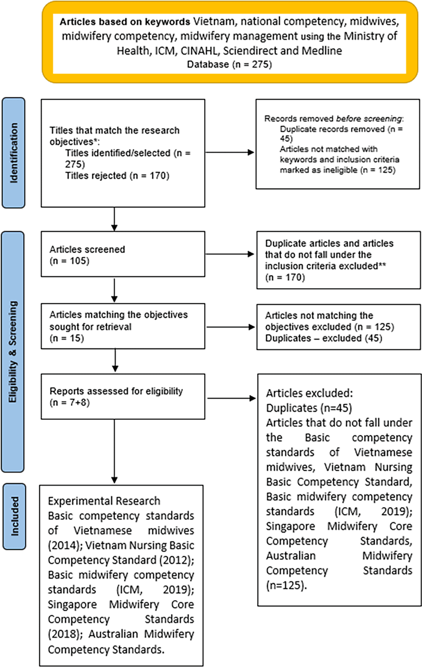Phase 1: phase 1 consisted of a systematic review to synthesize the initial set of competency standards. A literature review was conducted to identify the Vietnamese and international literature on midwifery competency standards. The review included material from established databases such as the Ministry of Health, ICM, CINAHL, Sciencedirect and Medline as well as conference presentations, national and international publications and reports from regulatory and professional bodies. Keywords included in the literature were “midwifery competency standards”; “bachelor of midwifery”; “professional competency standards”. The literature resources were identified according to the following criteria: (1) midwifery population; (2) the competency standards and the elements were examined. The PRISMA Flow Diagram was used to guide the search (Thanh Le et al., 2023).