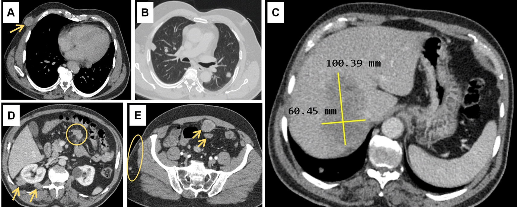 (A): Subcutaneous soft tissue nodule of the anterior right thoracic wall (arrow). (B): Bilateral pulmonary nodules. (C): Hypodense hepatic mass in the right lobe on the portal phase, measuring 100 × 60 millimetres. (D): Intraperitoneal adenomegalies (circle) and heterogeneous nodules in the right perirenal retroperitoneal region. (E): Heterogeneous peritoneal nodules (arrows) and small subcutaneous soft tissue nodules in the right lateral abdominal wall (circle).
