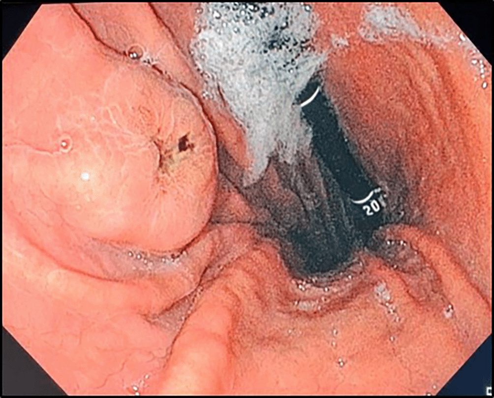 A recent systematic review by Reggiani et al.9 included 113 patients with gastric melanoma metastases, predominantly from skin primary lesions (62%). Most patients were male (64%) with a median age of 63 years. Only 10% were asymptomatic, while common symptoms included bleeding (34.5%), abdominal pain (34.5%), anorexia and weight loss (23%), and nausea/vomiting (17.7%). Dyspepsia was noted in 5.3%. Gastric metastases were single in 42.5% and mostly located in the gastric body (60.2%). However, variability in lesion descriptions across studies prevented the identification of consistent endoscopic features.