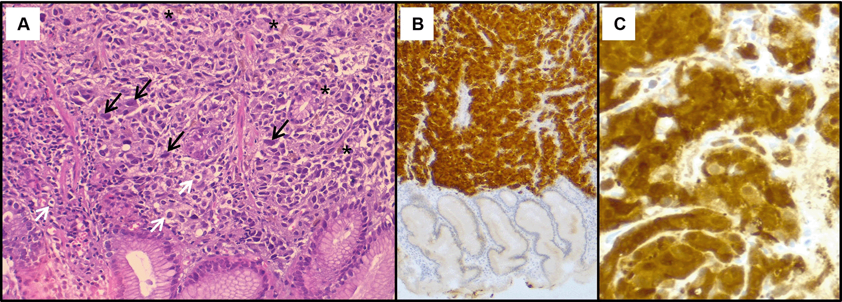 (A): Haematoxylin & eosin staining on x200 magnification shows malignant proliferation infiltrating the gastric mucosa. Tumour cells are pleomorphic and disaggregated, exhibiting marked nuclear atypia with hyperchromatic and sometimes monstruous nuclei (black arrows). Some larger cells with clear cytoplasm were present (white arrows). Deposits of brown pigments are also seen (*). Immunohistochemistry demonstrated positive staining with Melan-A (B) and PS 100 (C).