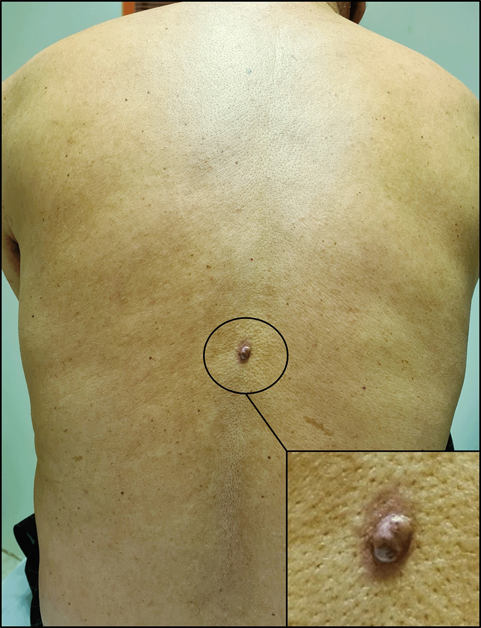 With these results in mind, a thorough skin examination was thus undertaken unveiling a cutaneous lesion in the back, manifesting as a circumscribed pink nodule of 8 mm with brown discoloration ( Figure 4).
