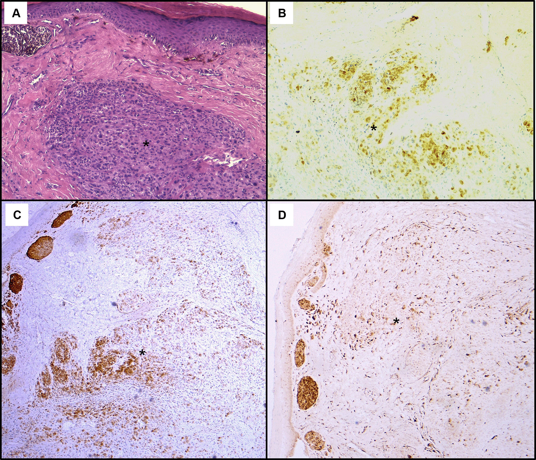 (A): Haematoxylin & eosin staining on x100 magnification shows malignant cellular proliferation (*) in the dermis, composed of vaguely naevoid cells and larger cells with abundant eosinophilic cytoplasm, atypical pleomorphic nucleolated nuclei, and no junctional activity. On immunohistochemistry, tumour cells exhibit positive staining for HMB45 (B), Melan-A (C), and p16 (D).
