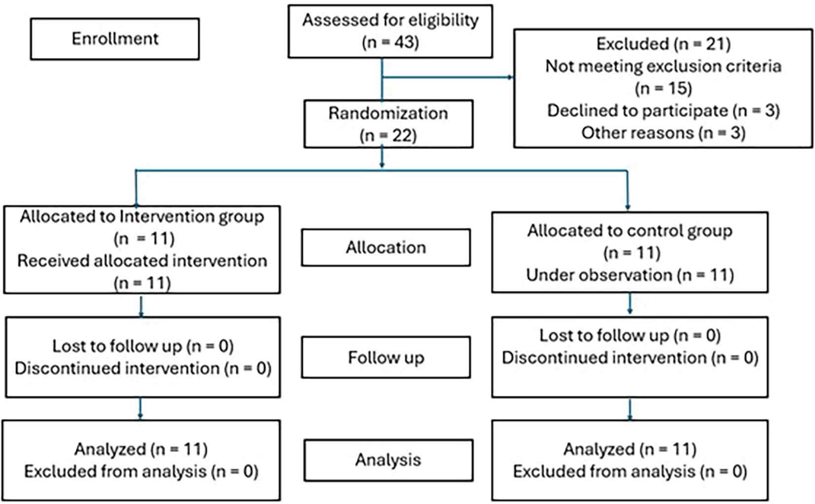 The participants were recruited from the community (Udupi and nearby districts, Karnataka) through geriatric camps, community visits and screening inmates from old age homes. This preliminary study included 22 older adults with mild cognitive impairment (MCI). The group consisted of 11 males and 11 females, with a mean age of 69.18 (6.35). All participants had a Montreal Cognitive Assessment (MoCA) score between 19 and 25 and had no history of neurological conditions or psychological disorders. The participants were randomly assigned to either the control group (n=11) or the experimental group (n=11). All participants had normal or corrected-to-normal vision in both eyes. They also had a mean (SD) pure tone average of 21.4 (3.61) dBHL in the right ear and 23.4 (4.84) dBHL in the left ear, as assessed across audiometric frequencies (250, 500, 1 kHz, 2 kHz, 4 kHz, and 8 kHz). All participants were native Kannada Speakers with proficiency in reading and writing and had completed at least ten years of education.