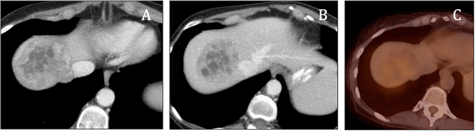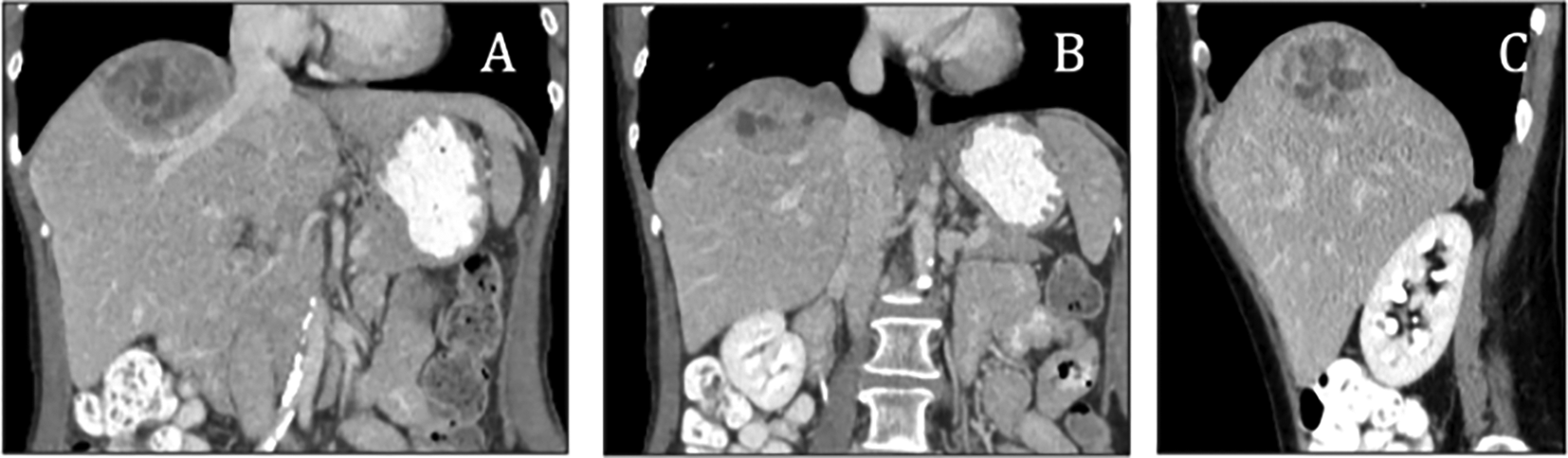 A computed tomography (CT) scan of the abdomen revealed a large, heterogeneous solid mass in the right lobe of the liver (Figure 1). Subsequent PET/CT imaging indicated mild activity in the hepatic mass (Figure 2). Laboratory evaluations demonstrated markedly elevated levels of urinary metanephrines, with total metanephrines measured at 10,211 mcg/24 hours (urinary metanephrines at 3,375 mcg/24 hours and urinary normetanephrine at 6,836 mcg/24 hours). Additionally, her blood norepinephrine level was found to be 702 pg/ml. During the surgery, a diaphragmatic paraganglioma was discovered and subsequently resected (Figure 3).