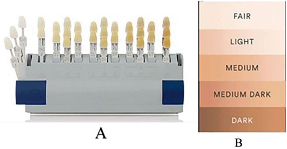 1. In this study, participants with different skin shades were not evenly selected. Light shade (n=5), fair shade (n=14), medium shade (n=45), Medium Dark shade (n=37), or dark shade (n=19). This can influence the results with respect to the relationship between skin shade and the satisfaction of existing tooth shades, along with tooth shades preferred by the participants of different skin shades.