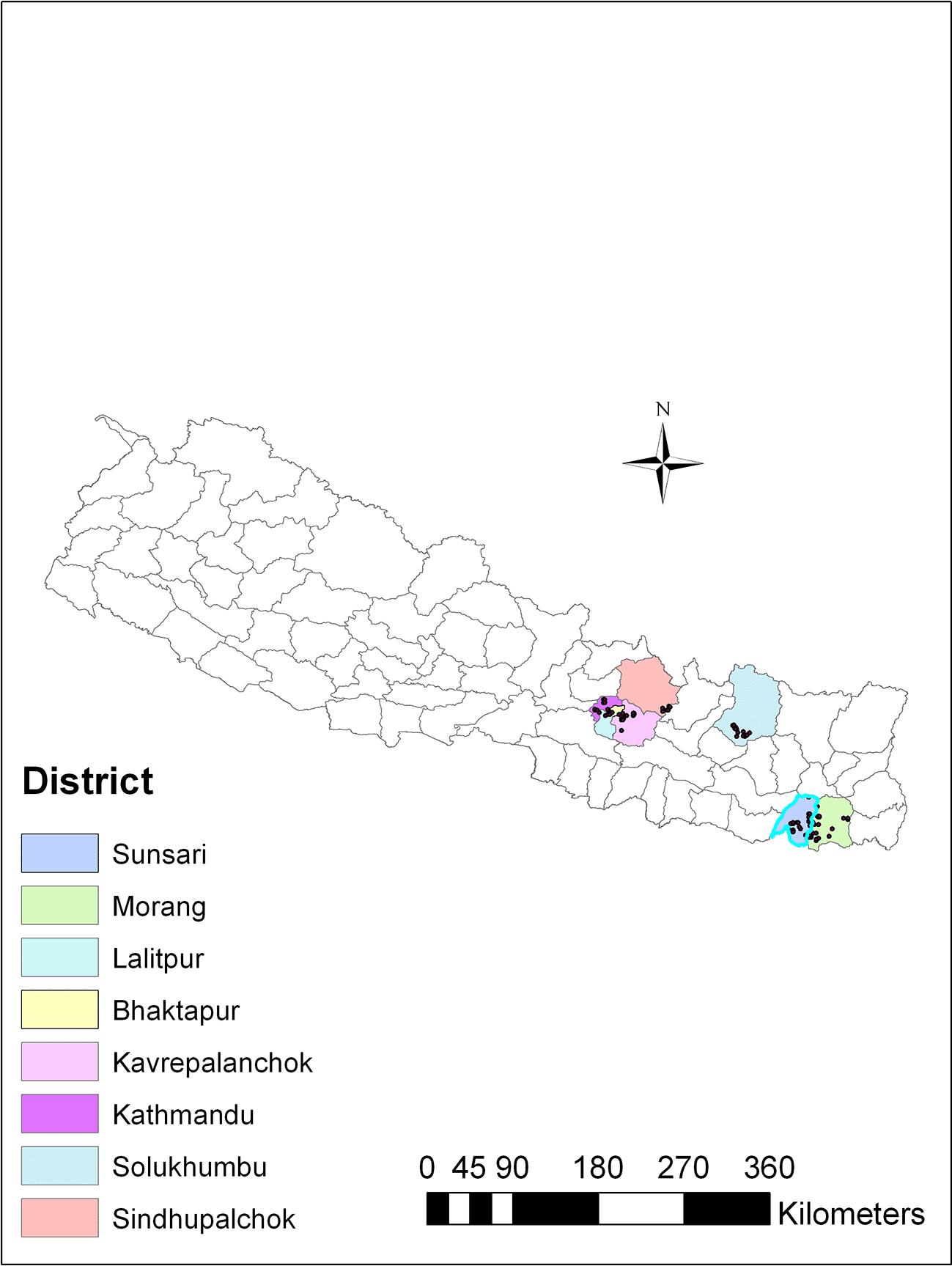 To isolate Trichoderma, soil samples were collected from different agricultural regions spanning three ecological zones in Nepal: the plain region (80-141 m above sea level), the mid-hill region (1284-1650 m above sea level), and the high mountain region (1800-2500 m above sea level). These regions exhibited variations in altitude and ecological traits, and were recognized for cultivating a range of agricultural crops. The soil samples were collected from vegetable-growing areas within each region, covering eight districts in Nepal, including Sindhupalchok and Solukhumbu districts in the high mountains; Kathmandu, Lalitpur, Bhaktapur and Kavrepalanchok districts in the mid-hills, and Sunsari and Morang in the plains (Figure 1).