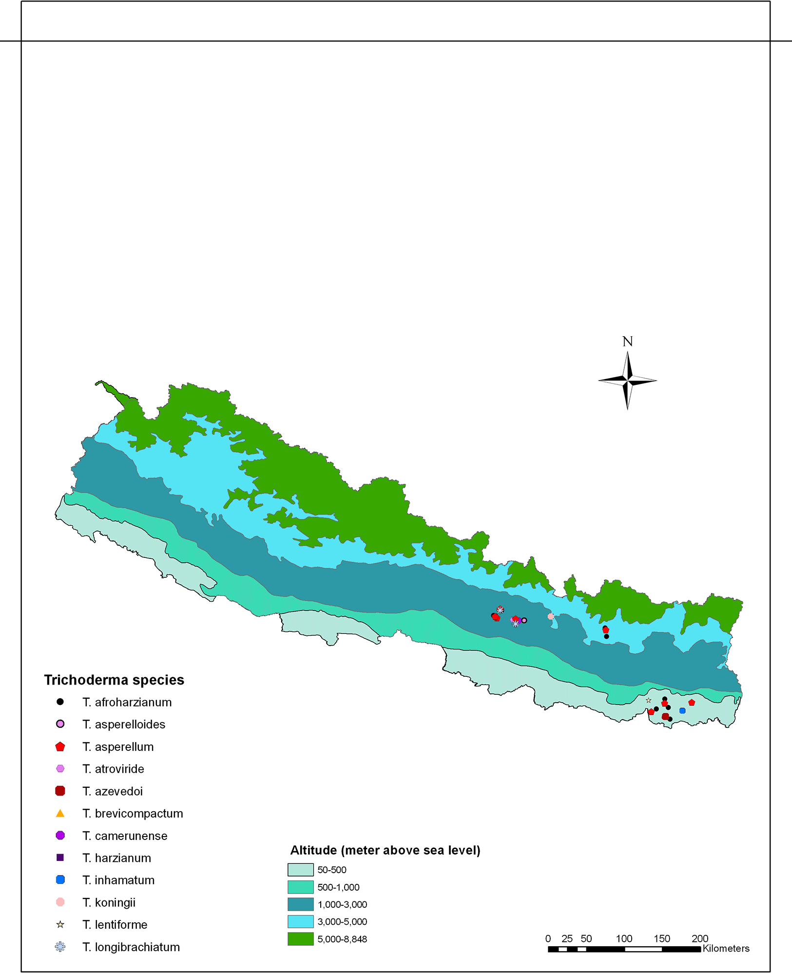 The remarkable biodiversity found in Nepal can be attributed directly to its unique geographical position, which spans a broad spectrum of altitudinal variances and a wide array of climatic conditions. Consequently, Nepal holds a significant position as one of the world’s important biodiversity hotspots. The fungal genus Trichoderma has been extensively studied for its diverse metabolites and their applications in agriculture, industry and health.6 Its ability to establish beneficial interactions with plants and produce bioactive compounds makes it a valuable resource for sustainable and eco-friendly solutions in multiple sectors.26,27,54 However, there have been very few studies on the diversity of Trichoderma species in Nepal compared to other parts of the world.10,15,35